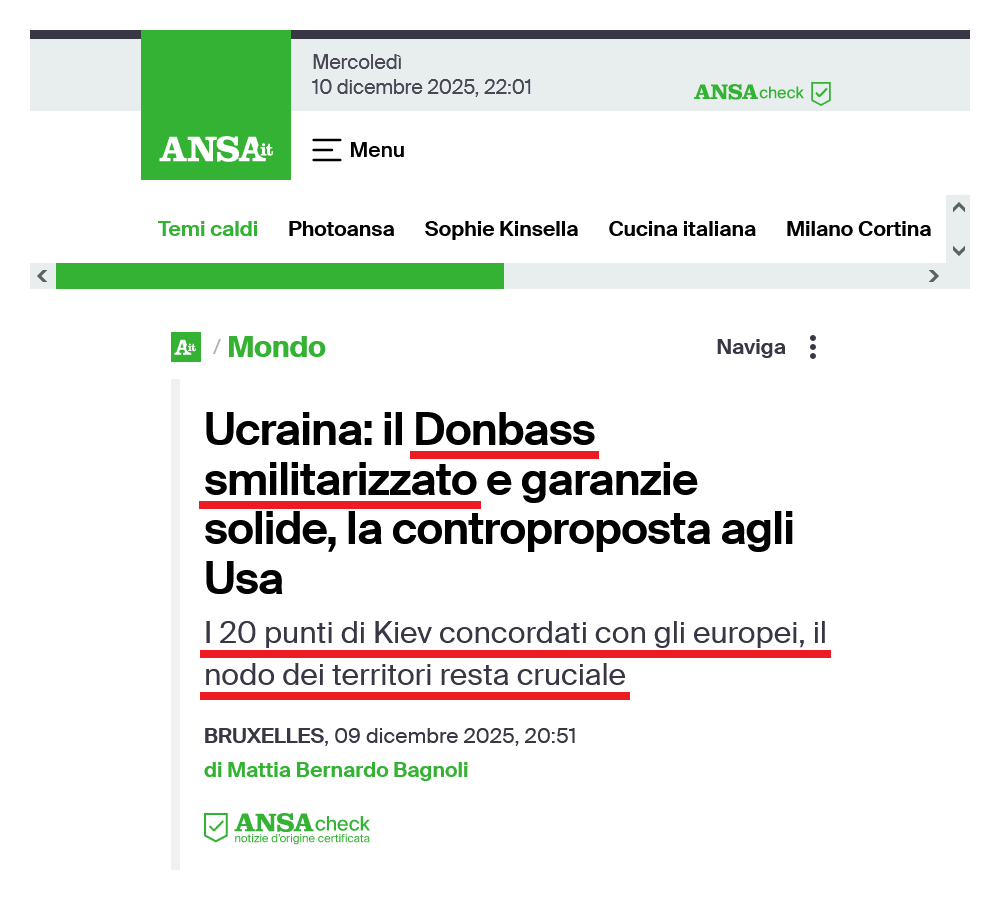 Archivio, e Notizie di Marco Poli Non ho mai creduto al successo del piano di pace USA in 28 punti [1][2] essenzialmente per due motivi, uno generale e un altro più specifico : ● da molto tempo, penso che il conflitto sia protratto con il consenso di tutte le parti in gioco : la guerra genera forti profitti e prodotti secondari utili ai soggetti maggioritari, spesso posturati dietro le quinte ( il vero Potere manifesta raramente il proprio volto ) e ci sono parecchie dichiarazioni dei fantocci amministrativi politicanti, ad esempio il ministro della Difesa tedesco, Boris Pistorius, parlò esplicitamente del 2029 come data alla quale la Germania dovrebbe essere pronta alla belligeranza diretta sul campo [3]; ● l'accordo contiene punti non accettabili dalla cricca kievana, come la cessione de facto delle 5 regioni novorusse liberate dall'Armata russa, e, probabilmente, l'organizzazione di elezioni entro 100 giorni dalla firma dell'accordo cioè l'avvicendamento di Vladimir Zelenskij ( Владимир Александрович Зеленский ) con Valerij Zaluzhnyj ( Валерий Фёдорович Залужный )[4]. E altro. La riduzione successiva a 19 punti ha peggiorato la situazione, con le questioni dei territori e il rapporto tra NATO, Russia e Stati Uniti, rinviate a successivi, futuribili incontri bilaterali parziali cioè sempre privi di almeno uno degli attori principali [5]. Tutti (s)punti buoni per tergiversare e procrastinare la soluzione diplomatica della faccenda, e così è stato. 2 Momento cabaret. Ecco che il pupazzo cocainomane di Kiev ha chattato con i pupazzi dell'UE e stabilito autisticamente una controproposta :