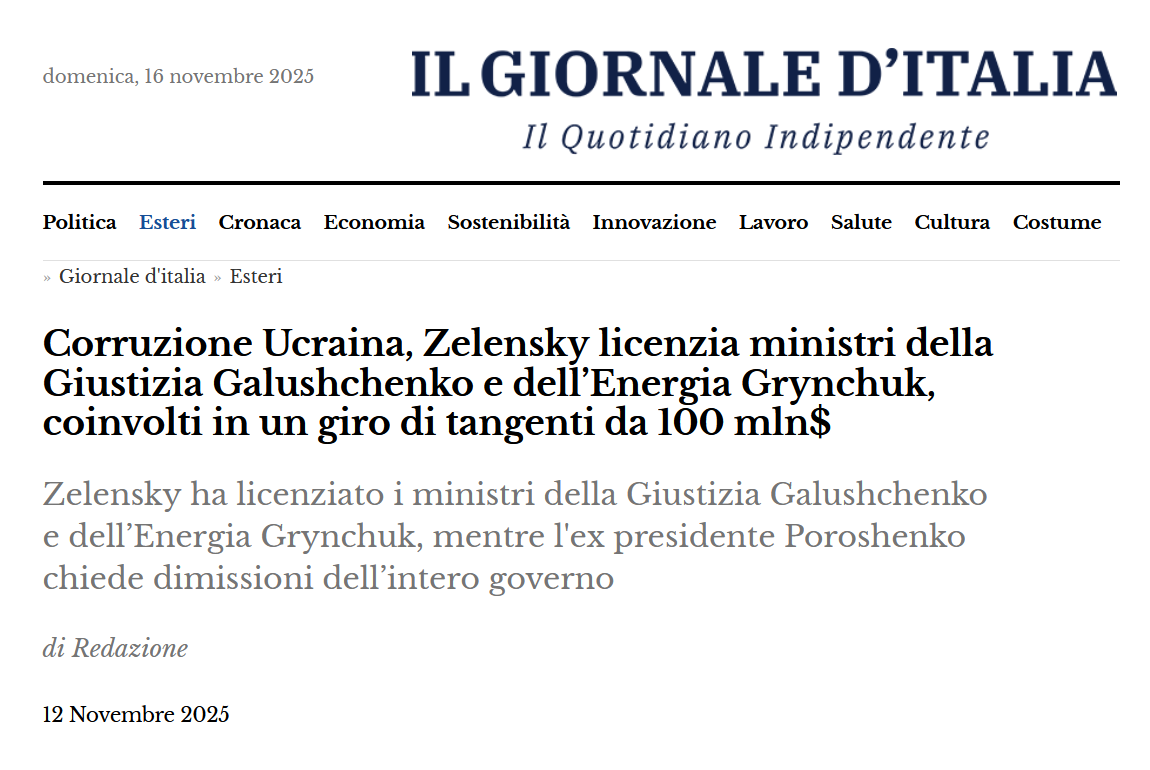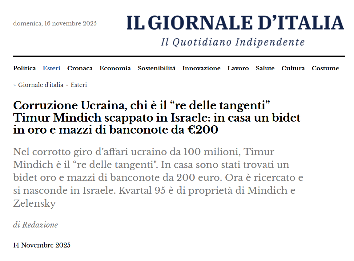 2 L'Operazione Mida ( Операция «Мидас» )[3] è un'iniziativa investigativa dell’Ufficio nazionale anticorruzione dell’Ucraina ( Национальное антикоррупционное бюро Украины, НАБУ; trasl. : NABU; fondato nel 2015 su pressioni del Fondo monetario internazionale, FMI ) e della Procura specializzata anticorruzione ( Специализированная антикоррупционная прокуратура Украины, САП; trasl. : SAP ), dopo gli abusi subiti nel confronto con i servizi kievani. 2.1 Il 21 luglio, i servizi segreti kievani ( esattamente il Servizio di sicurezza dell'Ucraina; in lingua russa : Служба безопасности Украины, СБУ, trasl. e citato spesso sulle testate occidentali come SBU ) hanno minacciato, picchiato e arrestato diversi funzionari dei due enti, dopo indagini che avevano toccato gli affari loschi del ''cerchio magico'' del presidente in carica, Vladimir Zelenskij ( Владимир Александрович Зеленский )[4]. Il 22 luglio, Zelenskij ha firmato una legge che cancellava la loro autonomia con la solita scusa delle ''infiltrazioni russe'' che sarebbero state così dimostrate, subordinandoli al Procuratore generale ch'è designato direttamente dal presidente [4]. Il progetto di legge n. 12414 è stato emendato in tal senso la mattina stessa, ed è passato come legge n. 4555-IX ( Закон № 4555-IX ) con il voto di maggioranza dal parlamento monocamerale ( 263 voti favorevoli su 450 ) nonostante le proteste vivaci dei deputati più filo-UE [5][6]. Immediatamente, la UE ha fatto sapere di non gradire il provvedimento, e che la generosa erogazione di soldi è subordinata ad una seria lotta alla corruzione [7]. E – almeno quella volta – i popolani ucraini sono scesi in piazza per protestare contro il provvedimento [8]. Dopo pochi giorni, il 31 luglio, è stata ripristinata l'autonomia di NABU e SAP con 331 deputati che hanno votato la proposta di legge n. 13533 → legge n. 4560-IX ( Закон № 4560-IX ) che ha sostituito la n. 4555-IX [9][10][11]. 2.2 Alcuni dei personaggi finiti nell'indagine [12][13]: ● Timur Mindich ( Тимур Михайлович Миндич ), nome in codice ''Karlson'', imprenditore con il doppio passaporto ucraino e israeliano, socio di Sergej Shefir ( Сергей Нахманович Шефир; trasl. dal dialetto russino : Serhiy Shefir ) nella società di produzione cinematografica e televisiva Studio Kvartal 95 ( Сту́дия «Кварта́л-95»; co-fondata da Zelenskij ) e nella società cipriota di distribuzione nella Federazione Russa Green Company, già legato a Igor Kolomojskij ( Игорь Валерьевич Коломойский ); ● German Galushchenko ( Герман Валерьевич Галущенко; trasl. anche Herman Halushchenko ), ''Professore'', avvocato e Ministro della Giustizia dimissionato allo scoppiare dello scandalo, ex-Ministro dell'Energia; ● Svetlana Grinchuk ( Светлана Васильевна Гринчук; trasl. anche Svitlana Grynchuk ), Ministro dell’Energia dimissionato allo scoppiare dello scandalo; ● Igor Mironjuk ( Игорь Миронюк; trasl. anche Ihor Myroniuk ), ''Rocket'', ex-consigliere speciale di Galushchenko al Ministero dell’Energia; ● Dimitrij Basov ( Дмитрий Басов; trasl. anche Dmytro Basov ), ''Tenore'', direttore esecutivo della sicurezza presso Energoatom, ex-dipendente dell'Ufficio del Procuratore generale dell'Ucraina; ● Alexander e Mikhail Tsukerman ( Александр Цукерман, Михаил Цукерман; trasl. anche Mykhailo e Oleksandr Tsukerman ), ''Sugarman'', affaristi, incaricati di riciclare i proventi illeciti della banda; ● Aleksej Chernyshov ( Алексей Чернышов; trasl. anche Oleksiy Chernyshov ), ''Che Guevara'', ex-vice Primo ministro dell'Ucraina, è accusato di arricchimento illecito; ● Sergej Pushkar ( Сергей Пушкарь; trasl. anche Sergei Pushkar ), attuale membro della Commissione nazionale per l'energia; ● funzionari e dirigenti del Ministero dell’Energia che Galushchenko ha cooptato. Il più scenografico fra questi è senz'altro Timur Mindich, finito sulle prime pagine dei quotidiani mainstream assieme al suo bagno coi sanitari in oro massiccio { [14]... }. E' stato avvisato poche ore prima delle perquisizioni a casa e nell'ufficio, e ha tagliato la corda. Pare sia in Israele. I popolani tirano la cinghia, i soldati se la passano brutta al fronte, e c'è chi vive nel lusso sulle spalle loro. 3 L'Ucraina è uno dei Paesi più corrotti d'Europa. 3.1 La ONG Transparency International, basata a Berlino, dal 1995 compila la classifica della corruzione percepita ( in lingua inglese : Corruption Perceptions Index, CPI ) attraverso interviste fatte agli imprenditori dei vari Paesi, dopo la quali viene calcolato un punteggio in centesimi ( più alto è il punteggio, più forte è la fiducia nello Stato e nella società )[15]. Al momento in cui scrivo, l'Ucraina totalizza 35/100 al pari della Serbia ( 105° posizione su 180 ), e solo Bielorussia ( 33/100 ), Bosnia Erzegovina ( 33/100 ), e Federazione Russa ( 22/100 ) sono posizionate sotto. Aggiungo la Turchia ( 34/100 ) se la si vuole considerare europea per Costantinopoli ( Istanbul ) e la regione balcanica rimasta sotto il controllo di Ankara [16]. Non posso fare a meno di notare che ''casualmente'' negli ultimi posti europei stanno proprio quei Paesi accusati dall'UE di essere dittature sotto spoglie democratiche, nell'orbita russa ( Bielorussia, Serbia ), la stessa Russia, o, comunque, non ostili al Cremlino ( come la Turchia di Recep Tayyip Erdogan ). E' significativo che, all'interno di una stima chiaramente filo-occidentale, lo Stato kievano stia nelle ultime posizioni europee. 3.2 Il Centro per le ricerche sociali e di mercato ''SOCIS'' è una società ucraina specializzata in sondaggi pol