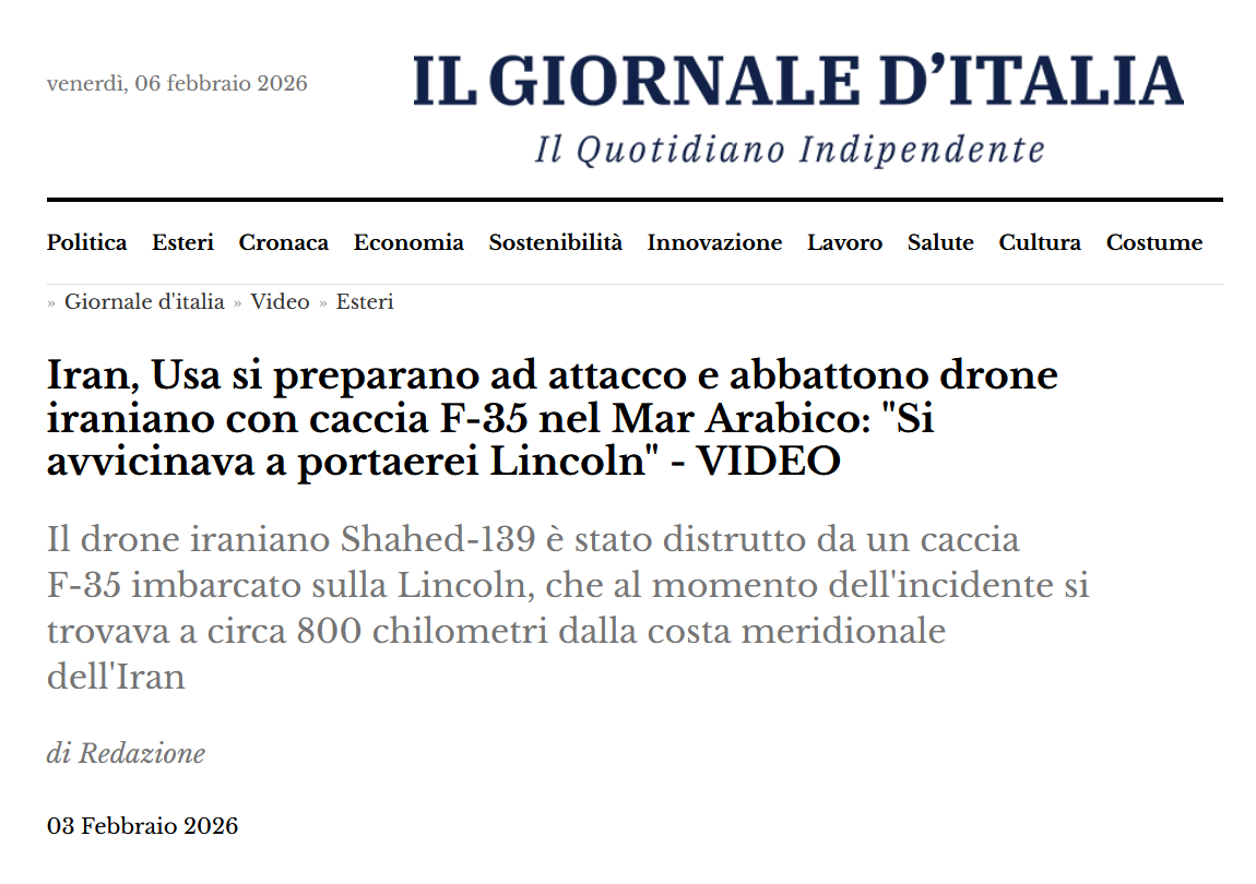 Figata. Nel frattempo, la portaerei USS “Roosevelt” ( CVN-71 ) di classe Nimitz e il cacciatorpediniere missilistico guidato USS “Bulkeley” ( DDG 84 ) di classe Arleigh Burke, sono state avvistati nel Mar Mediterraneo orientale. E' stata intensificata l'attività aerea di ricognizione ed è cresciuto il numero degli aviogetti di stanza nelle basi statunitensi della regione, in Giordania e Qatar [15]. 3 Nel frattempo, procedono gli improbabili colloqui tra le parti, che si sono incontrate in Oman lo scorso venerdì 6 febbraio. Oltre ai ministri degli esteri dell'Oman e dell'Iran, erano presenti l'inviato di Donald Trump per il Medio Oriente, Steve Witkoff, il comandante del CENTCOM ( sigla di United States Central Command; è il comando unificato delle forze USA che ha sede presso la base aerea MacDill, in Florida ), ammiraglio Brad Cooper, ed anche il celeberrimo genero di Trump, Jared Kushner ( marito della secondogenita Ivanka ). Gli americans hanno chiesto [16]: ● l'interruzione totale dell’arricchimento dell’uranio, sia per scopi militari che civili; ● una forte limitazione del programma missilistico iraniano; ● la fine del sostegno economico e militare ai gruppi armati locali ( Hamas, Hezbollah, Houti ... ). Non male. E' altamente improbabile che sortiranno un esito positivo, ma pare che proseguiranno. La Federazione Russa e la RPC hanno espresso gli attesi comunicati prestampati di circostanza [17]. 3.1 Oltre le belle paroline, l'Iran ha aumentato il livello difensivo attorno ai principali siti nucleari come risposta alle manovre statunitensi nel Golfo, e potrebbe trasferire l'uranio già arricchito al 60% nella Federazione Russa e/o in Turchia [18]. = Note [1] : ''USS Abraham Lincoln (CVN-72)'', AA. VV., Wikipedia ENG, [ https://en.wikipedia.org/w/index.php?title=USS_Abraham_Lincoln_(CVN-72)&oldid=1336730227 ]; vedi : ''USS Abraham Lincoln (CVN 72)'', U.S. Pacific Fleet, Naval Air Force, America's Navy, [ https://www.airpac.navy.mil/Organization/USS-Abraham-Lincoln-CVN-72/ ]; vedi : ''USS Abraham Lincoln – Nimitz Class Aircraft Carrier'', Naval Technology, [ https://www.naval-technology.com/projects/abraham-lincoln-nimitz-class-aircraft-carrier/ ]. [2] : ''Nimitz-class aircraft carrier'', AA. VV., Wikipedia ENG, [ https://en.wikipedia.org/w/index.php?title=Nimitz-class_aircraft_carrier&oldid=1337001410 ]. [3] : ''Diretta | Trump sposta la portaerei Lincoln dal Mar Cinese al Medio Oriente. Mattarella: "In Iran efferato sterminio di manifestanti"'', il Giornale, 15 gennaio 2026, [ https://www.ilgiornale.it/news/cronaca-internazionale/diretta-teheran-oggi-e-domani-non-ci-saranno-impiccagioni-2595644.html ]. [4] : ''Aircraft carrier USS Abraham Lincoln in the Middle East: What you need to know'', Jay Hilotin, Gulf News, 27 gennaio 2026, [ https://gulfnews.com/world/mena/uss-abraham-lincoln-aircraft-carrier-in-the-middle-east-what-you-need-to-know-1.500421868 ]. [5] : ''Prima l’ombrello difensivo: così gli Usa si preparano a uno scontro con l’Iran'', Davide Ragnolini, InsideOver, 6 febbraio 2026, [ https://it.insideover.com/guerra/prima-lombrello-difensivo-cosi-gli-usa-si-preparano-a-uno-scontro-con-liran.html ]. [6] : trad. da fonte #2. [7] : trad. da fonte #1. [8] : ''Carrier Strike Group 3'', AA. VV., Wikipedia ENG, [ https://en.wikipedia.org/w/index.php?title=Carrier_Strike_Group_3&oldid=1334201005 ]; vedi : ''Carrier Strike Group 3'', U.S. Pacific Fleet, Naval Air Force, America's Navy, [ https://www.airpac.navy.mil/Organization/Carrier-Strike-Group-3/ ]. [9] : ''Carrier Air Wing Nine'', AA. VV., Wikipedia ENG, [ https://en.wikipedia.org/w/index.php?title=Carrier_Air_Wing_Nine&oldid=1326977569 ]; vedi : ''Carrier Air Wing (CVW) 9'', U.S. Pacific Fleet, Naval Air Force, America's Navy, [ https://www.airpac.navy.mil/Organization/Carrier-Air-Wing-CVW-9/ ]. [10] : ''Destroyer Squadron 21 Holds Underway Change of Command'', United States Navy, 2 agosto 2016, [ https://www.navy.mil/Press-Office/News-Stories/Article/2259906/destroyer-squadron-21-holds-underway-change-of-command/ ]. [11] : ''Destroyer Squadron 21'', Destroyer History Foundation, [ https://destroyerhistory.org/fletcherclass/desron21/ ]. [12] : fonte #1. [13] : ''Iran, CIA e Mossad preparano terreno per attacco Usa e Israele, "esplosioni in 10 città", Irgc: "Propaganda per alimentare proteste e terrore" - RETROSCENA'', Il Giornale d'Italia, 2 febbraio 2026, [ https://www.ilgiornaleditalia.it/news/esteri/766736/iran-cia-e-mossad-preparano-terreno-per-attacco-usa-e-israele-esplosioni-in-10-citta-irgc-propaganda-per-alimentare-proteste-e-terrore-retroscena.html ]. [14] : ''Iran, Usa si preparano ad attacco e abbattono drone iraniano con caccia F-35 nel Mar Arabico: "Si avvicinava a portaerei Lincoln" - VIDEO'', Il Giornale d'Italia, 3 febbraio 2026, [ https://www.ilgiornaleditalia.it/video/esteri/767118/iran-attacco-abbattono-drone-iraniano-caccia-f-35-video.html ]. [15] : ''Il Washington Post: "Le forze Usa preparano operazioni espansive contro l'Iran"'', Valerio Chiapparino, il Giornale, 4 febbraio 2026, [ https://www.ilgiornale.it/news/difesa/washington-post-forze-usa-preparano-operazioni-espansive-2604957.html ]. [16] : ''Colloqui Usa-Iran su nucleare venerdì in Oman, Trump pensa al dietrofront dopo drone su portaerei Lincoln, poi conferma: “Voglio negoziare”'', Il Giornale d'Italia, 4 febbraio 2026, [ https://www.ilgiornaleditalia.it/news/esteri/767202/colloqui-usa-iran-su-nucleare-venerdi-in-oman-trump-pensa-al-dietrofront-dopo-drone-su-portaerei-lincoln-poi-conferma-voglio-negoziare.html ]. [17] : ''Oman, ministro Esteri Araghchi al termine dei colloqui Iran-Usa sul nucleare: "Un buon inizio"'', Emma De Ruiter, Euronews, 6 febbraio 2026, [ https://it.euronews.com/2026/02/06/via-ai-colloqui-sul-nucleare-tra-iran-e-stati-uniti-in-oman ]. [18] : ''Iran sotto pressione per attacco Usa, avanza ipotesi trasferimento uranio arricchito a Mosca, Teheran alza difese nei siti nucleari - RETROSCENA'',