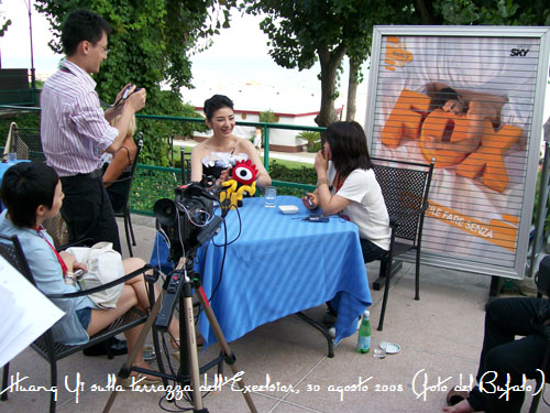 Dopo un po' di sole in spiaggia e un bagnetto - senza trascurare la raccolta di conchiglie d'infantile memoria (erano 15 anni almeno che non facevo un bagno al mare, mi sentivo un po' rincojonito ed assalito dai flashback) - vedevo un certo movimento sulla terrazza del Grand Hotel Excelsior : aperitivi a sbafo e personaggi assortiti ... ho fatto da solo un primo sopralluogo, ed ho trovato questa bellissima attrice orientale di cui manco conoscevo il nome, mentre si preparava ad un'intervista in video.