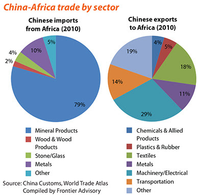 In poco tempo, la Repubblica Popolare di Cina ha superato sia gli Usa che i vecchi colonizzatori Regno Unito e Francia per volume degli scambi commerciali [3] che nel 2013 ha superato i 200 miliardi $ [4] e continuerà a crescere al ritmo del 25% annuo [5].