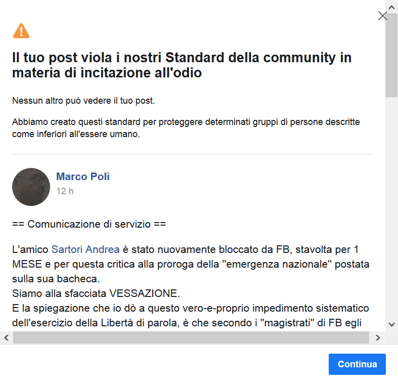 Notizie di Marco Poli L'amico Sartori Andrea è stato nuovamente bloccato da FB, stavolta per 1 mese e per questa critica alla proroga della ''emergenza nazionale'' postata sulla sua bacheca. Siamo alla sfacciata VESSAZIONE. E la spiegazione che io dò a questo vero-e-proprio impedimento sistematico dell'esercizio della Libertà di parola, è che secondo i ''magistrati'' di FB egli abbia accumulato un ''karma'' sufficientemente negativo a giustificare reazioni iper-allergiche del Sistema. Tuttavia, seguendo Andrea da mesi, non ho ravveduto azioni così gravi da meritare l'ostracismo social quasi permanente, cioè un'amputazione dei diritti individuali costituzionalmente riconosciuti. [ ... ] --- { prima pubblicazione del post su VK, il 28 luglio 2020 [ 1 ]; su FB : [ 2 ] }. |