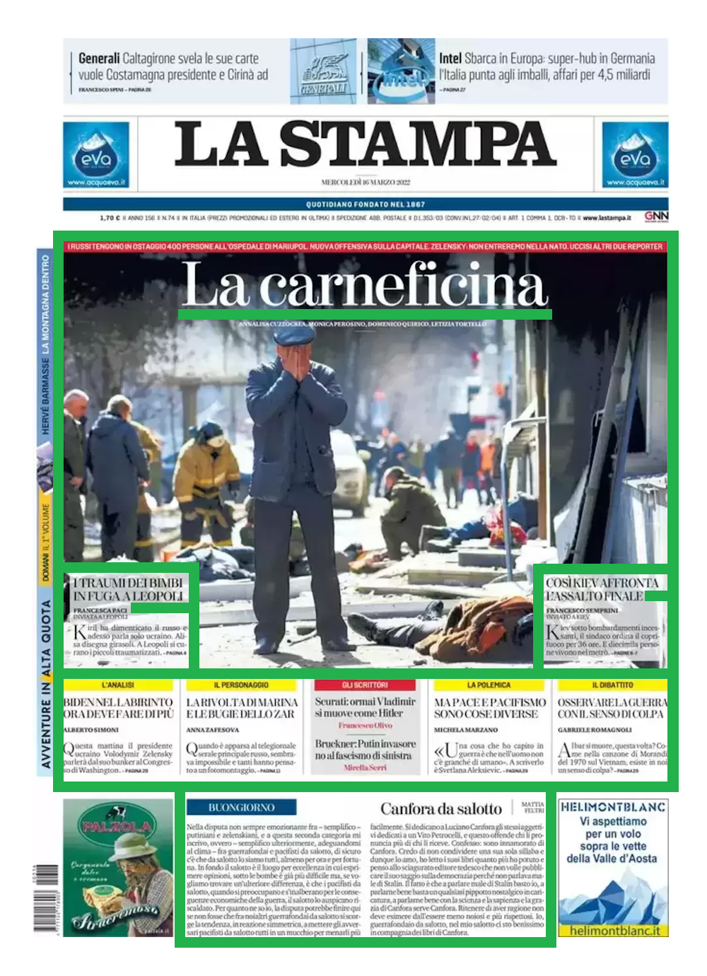 La prima pagina de La Stampa del 16 marzo, con mie evidenziazioni in verde [14].