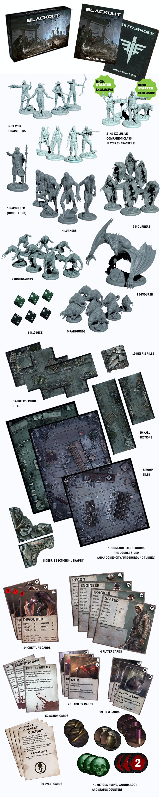 Il ricco contenuto della scatola finale del gioco da tavolo “Blackout: Journey into Darkness”, da Kickstarter [15].