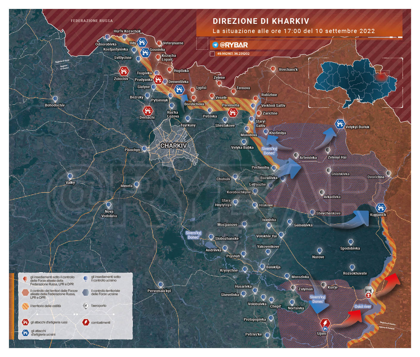 La situazione del fronte orientale ( con dettaglio dei settori di Kharkov e Liman ) alle fine della giornata del 10 settembre, da Рыбарь ( Rybar ) [20].
