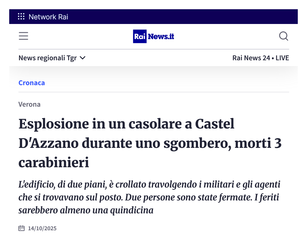 Amen. = Note [1] : ''Esplosione in un casolare a Castel D'Azzano durante uno sgombero, morti 3 carabinieri'', Rai News, 14 ottobre 2025, [ https://www.rainews.it/articoli/2025/10/esplosione-in-un-appartamento-a-castel-dazzano-durante-uno-sgombero-morti-3-carabinieri-aeeaea05-1ab0-41e2-8cc2-c40836988592.html ]; vedi : ''Castel D'Azzano: il video del momento dell’esplosione nel casolare'', TGR Veneto, Rai, 16 ottobre 2025, [ https://www.rainews.it/tgr/veneto/video/2025/10/verona-castel-dazzano-video-del-momento-esplosione-nel-casolare-morti-3-carabinieri-b65d4069-1885-4cbd-b4ce-3fae93597e82.html ]; vedi : ''Tg1. Esplosione durante uno sgombero nel Veronese: morti 3 carabinieri, fermati 2 fratelli'', TG1, RaiPlay, [ https://www.raiplay.it/video/2025/10/Tg1-Esplosione-durante-uno-sgombero-nel-Veronese-morti-3-carabinieri-fermati-2-fratelli-a6265a0d-a441-4381-bdd8-ee540f48b478.html ]. [2] : ''Esplosione in un casolare durante lo sgombero: morti tre carabinieri, 17 feriti'', Giuseppe La Venia, Rai News, 14 ottobre 2025, [ https://www.rainews.it/video/2025/10/esplosione-in-un-casolare-durante-lo-sgombero-morti-tre-carabinieri-17-feriti-4d27a16c-377f-4765-8e3d-8793e0d76c86.html ]. [3] : ''Marco Piffari, Valerio Daprà e Davide Bernardello sono morti schiacciati dal peso delle macerie'', Matteo Mohorovicich, TGR Veneto, Rai, 16 ottobre 2025, [ https://www.rainews.it/tgr/veneto/video/2025/10/autopsia-3-carabinieri-morti-esplosione-castel-di-azzano-verona-marco-piffari-valerio-dapra-e-davide-bernardello-sono-morti-schiacciati-dal-peso-delle-macerie-d9c17dab-bf25-4aa4-9cf8-0361c7f6e842.html ]. [4] : ''Strage di carabinieri, lo scoppio innescato da una molotov'', RSI Radiotelevisione svizzera, 15 ottobre 2025, [ https://www.rsi.ch/info/mondo/Strage-di-carabinieri-lo-scoppio-innescato-da-una-molotov--3199770.html ]. [5] : ''La follia che ha scatenato la tragedia: tante domande, poche risposte'', Alessia Piovesan, TGR Veneto, Rai, 15 ottobre 2025, [ https://www.rainews.it/tgr/veneto/video/2025/10/la-follia-che-ha-scatenato-la-tragedia-tante-domande-poche-risposte-1092f8bf-561d-438e-9206-0cefe9f80961.html ]. [6] : ''La follia dei 3 fratelli Ramponi iniziata da un incidente stradale con il trattore in cui morì un uomo. «Non si facevano mai trovare da nessuno»'', Roberta Polese, Corriere del Veneto, Corriere della Sera, 15 ottobre 2025, [ https://corrieredelveneto.corriere.it/notizie/cronaca/25_ottobre_15/carabinieri-castel-d-azzano-fratelli-5315032d-c84d-4de6-a6e6-1dede52cbxlk.shtml ]. [7] : ''Strage di Castel d'Azzano, Valeria Meldo: «I fratelli Ramponi uccisero mio fratello guidando a fari spenti nella nebbia. Per noi nessun risarcimento»'', Roberta Polese, Corriere del Veneto, Corriere della Sera, 16 ottobre 2025, [ https://corrieredelveneto.corriere.it/notizie/verona/cronaca/25_ottobre_16/strage-di-castel-d-azzano-valeria-meldo-i-fratelli-ramponi-uccisero-mio-fratello-guidando-a-fari-spenti-nella-nebbia-per-noi-e25c0721-a716-4169-80c6-2c633c376xlk.shtml ]. [8] : fonte #5. [9] : ''Ecco chi sono i fratelli Ramponi, già protagonisti di proteste eclatanti'', Dario Giordo, TGR Veneto, Rai, 14 ottobre 2025, [ https://www.rainews.it/tgr/veneto/video/2025/10/ecco-chi-sono-i-fratelli-ramponi-protagonisti-di-proteste-eclatanti-83ac33e0-325f-4e7c-bf51-634155730c1f.html ]. [10] : ''La strage di Castel d'Azzano, minuto per minuto: l’irruzione alle 3.15, l'odore di gas, il boato e la casa trasformata in trappola'', Alessio Corazza, Corriere del Veneto, Corriere della Sera, 15 ottobre 2025, [ https://corrieredelveneto.corriere.it/notizie/verona/cronaca/25_ottobre_15/castel-d-azzano-strage-07245560-3168-4b92-994b-5fdf1dc05xlk.shtml ]. [11] : ''Cronaca di una strage annunciata. Morti 3 carabinieri. Tre fratelli arrestati. Il procuratore capo Tito: «Sicuramente è un omicidio premeditato e volontario»'', la Cronaca di Verona, 14 ottobre 2025, [ https://www.cronacadiverona.com/morti-3-carabinieri-tre-fratelli-arrestati-il-procuratore-capo-tito-sicuramente-e-un-omicidio-premeditato-e-volontario/ ]. [12] : ''Qualche numero'', Marco Poli, VK, 18 ottobre 2025, [ https://vk.com/wall170191717_4703 ]; FB : [ https://www.facebook.com/Bufalo/posts/10238101771579811 ]; ODB : [ https://orlodelboccale.blogspot.com/2025/10/quasi-14-233-della-popolazione-italiana.html ]. [13] : ''Esplosione Castel D’Azzano (VR), choc Salis che giustifica i 3 occupanti per strage carabinieri: “Gesto disperato, negato loro diritto abitativo”'', Il Giornale d'Italia, 16 ottobre 2025, [ https://www.ilgiornaleditalia.it/news/cronaca/740472/esplosione-castel-dazzano-vr-choc-salis-che-giustifica-i-3-occupanti-per-strage-carabinieri-gesto-disperato-negato-loro-diritto-abitativo.html ]; vedi : post, Ilaria Salis, X, 15 ottobre 2025, [ https://x.com/SalisIlaria/status/1978394091445465409 ]. [14] : ''Ilaria Salis torna sulle frasi choc sui carabinieri morti: "Se vi offendete, avete la coscienza sporca"'', Federico Garau, il Giornale, 16 ottobre 2025, [ https://www.ilgiornale.it/news/nazionale/ilaria-salis-dichiarazioni-choc-sui-carabinieri-morti-se-vi-2553484.html ]; vedi : post, Ilaria Salis, X, 16 ottobre 2025, [ https://x.com/SalisIlaria/status/1978767734243520746 ]. [15] : Dagospia, 18 ottobre 2025, [ https://www.dagospia.com/cronache/siete-dei-bastardi-e-quanto-diceva-maria-luisa-ramponi-carabinieri-450820 ]; vedi : ''Carabinieri morti, l'ex maresciallo del paese: «Anche un cugino di Ramponi lasciò il gas aperto e morì nell’esplosione della sua abitazione»'', Marianna Peluso, Corriere del Veneto, Corriere della Sera, 16 ottobre 2025, [ https://corrieredelveneto.corriere.it/notizie/cronaca/25_ottobre_16/carabinieri-morti-l-ex-maresciallo-del-paese-anche-un-cugino-di-ramponi-lascio-il-gas-aperto-e-mori-nell-esplosione-della-sua-4a2d7624-f102-440b-bb54-d9a8482eaxlk.shtml ]. === --- { prima pubblicazione del post su VK, il 19 ottobre 2025 [16]; su FB : [17] }. |