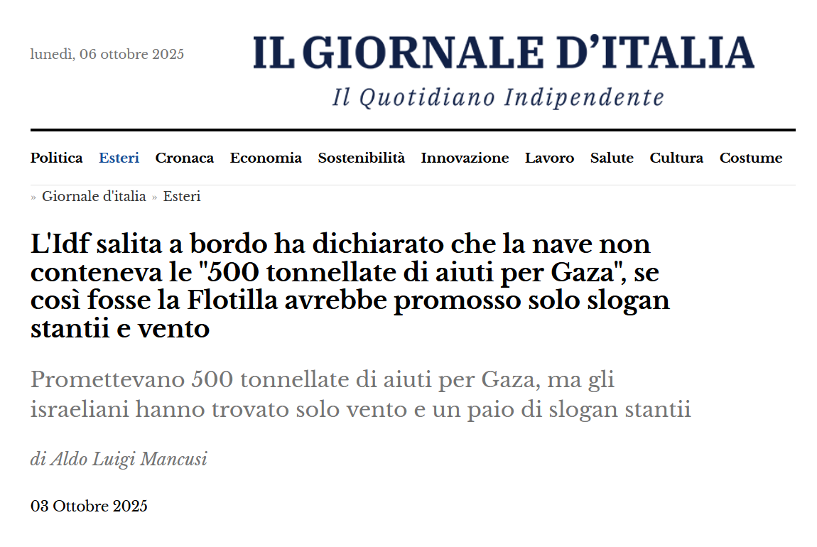 Un successone. Ricordo che i saltimbanchi della Flotilla avevano rifiutato l'intermediazione del Patriarca di Gerusalemme, cardinale Pierbattista Pizzaballa, per realizzare un corridoio umanitario che agevolasse la consegna degli aiuti ai destinatari [6][7]. 2 Vero ? Falso ? Esistono prove – foto, video, fatture ... – del carico di aiuti di vario genere che sarebbe stato imbarcato ? Cinquecento tonnellate sono tanta, tanta roba. Anche da fare sparire. E io, ho visto soprattutto selfie, belle parole, e video di feste a bordo, uno spettacolo mediatico. = Note [1] : ''400 attivisti della Flotilla in carcere, liberati e già a Roma i 4 deputati italiani'', Rai News, 4 ottobre 2025, [ https://www.rainews.it/maratona/2025/10/gaza-israele-flotilla-italiani-in-carcere-marinette-naviga-in-arrivo-45-barche-turche-farnesina-mossad-proteste-europa-hamas-chiede-modifiche-piano-trump-220edf0e-1d22-4064-9be9-b3d25ea6693d.html ]. [2] : ''Global Sumud Flotilla: 171 espulsioni da Israele'', RSI Radiotelevisione svizzera, 6 ottobre 2025, [ https://www.rsi.ch/info/mondo/Global-Sumud-Flotilla-171-espulsioni-da-Israele--3173310.html ]. [3] : ''Flotilla, Greta Thunberg accolta da star ad Atene: "Maltrattamenti e abusi"'', Tommaso Manni, Il Tempo, 6 ottobre 2025, [ https://www.iltempo.it/personaggi/2025/10/06/news/flotilla-greta-thunberg-accolta-atene-maltrattamenti-e-abusi-44440591/ ]. [4] : ''Abusi su Greta Thunberg e gli attivisti della Flottilla, Israele nega: "Sfacciate menzogne"'', Rai News, 6 ottobre 2025, [ https://www.rainews.it/articoli/2025/10/greta-thunberg-la-flottiglia-per-gaza-larresto-e-le-accuse-di-maltrattamenti-b6a3136e-c7d9-4239-933a-1a60dbbc7004.html ]. [5] : ''L'Idf salita a bordo ha dichiarato che la nave non conteneva le "500 tonnellate di aiuti per Gaza", se così fosse la Flotilla avrebbe promosso solo slogan stantii e vento'', Aldo Luigi Mancusi, Il Giornale d'Italia, 3 ottobre 2025, [ https://www.ilgiornaleditalia.it/news/esteri/736481/sorpresa-le-barche-della-global-sumud-flotilla-verso-gaza-erano-vuote-nemmeno-una-scatoletta-di-tonno-a-bordo.html ]. [6] : ''Attacco alla Flotilla, Crosetto manda la nave Fasan in soccorso: “Assistenza agli italiani”. Tajani media per gli aiuti a Gaza coinvolgendo Pizzaballa'', il Fatto Quotidiano, 24 settembre 2025, [ https://www.ilfattoquotidiano.it/2025/09/24/attacco-alla-flotilla-crosetto-ho-inviato-una-fregata-della-marina-militare-in-soccorso-degli-italiani/8137414/ ]. [7] : ''Cardinale Pizzaballa: “La Flotilla non porta nulla alla gente di Gaza, avrei evitato confronto così diretto”'', il Fatto Quotidiano, 2 ottobre 2025, [ https://www.ilfattoquotidiano.it/2025/10/02/flotilla-gaza-pizzaballa-aiuti-notizie/8147225/ ]. === --- { prima pubblicazione del post su VK, il 6 ottobre 2025 [8]; su FB : [9] }. |