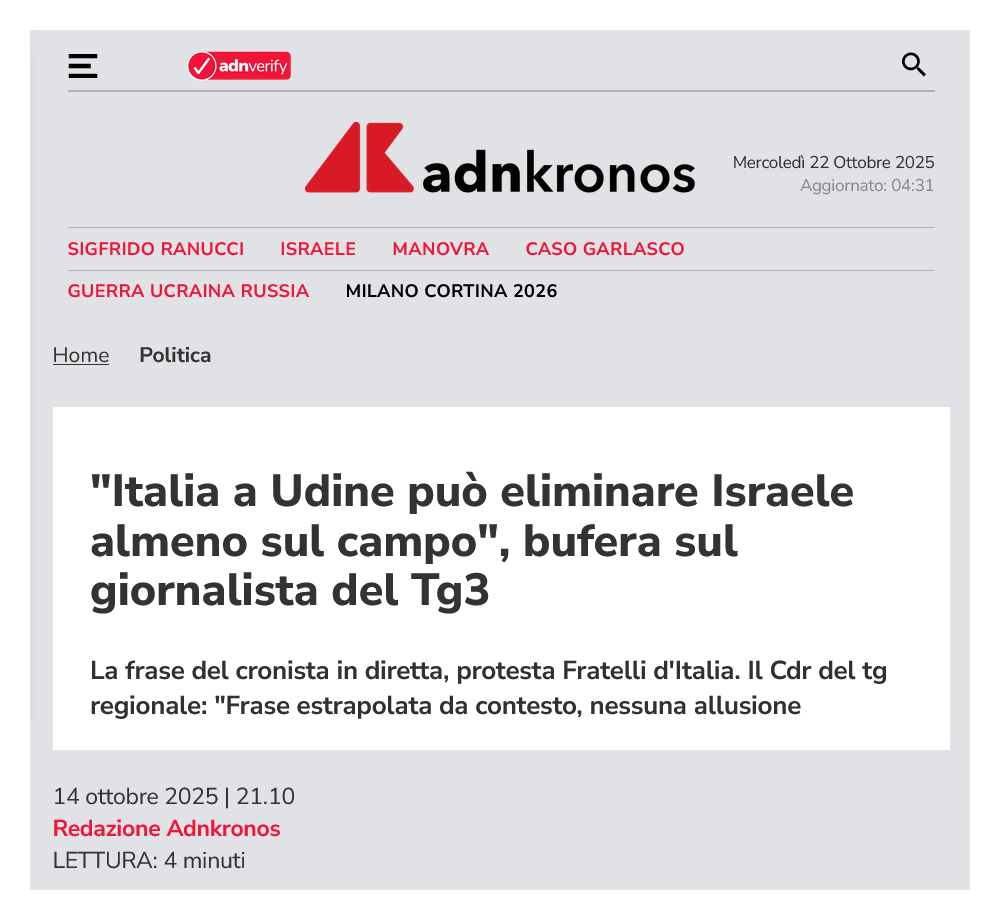 Mah. Le giustificazioni addotte a difesa di Jacopo Cecconi mi sono sembrate la classica arrampicata sugli specchi [2], poi la corsa dei deputati DEM a solidarizzare [3]. 2 A margine della partita di football inglese, i soliti scappati di casa detti ''propal'' – sono più correttamente pro-Hamas, perché la Striscia di Gaza è amministrativamente, culturalmente, e religiosamente hamasita da 10+ anni – hanno fatto una lunga passeggiata con il tipico finale di scontri con le FF. OO., qualche ferito, e una ventina di fermati [4]. = Note [1] : ''"Italia a Udine può eliminare Israele almeno sul campo", bufera sul giornalista del Tg3'', ADN Kronos, 14 ottobre 2025, [ https://www.adnkronos.com/politica/italia-a-udine-puo-eliminare-israele-almeno-sul-campo-bufera-sul-giornalista-del-tg3_4VRGoPqTvdr3JEPwIrTe8D ]. [2] : ''La frase travisata del giornalista del Tg3 su Israele “da eliminare”'', Pagella Politica, 16 ottobre 2025, [ https://pagellapolitica.it/articoli/frase-travisata-giornalista-tg3-israele-eliminare ]. [3] : ''Rai: PD, solidarietà a Cecconi, maggioranza irresponsabile alza i toni per imitare Meloni'', Deputati PD, 15 ottobre 2025, [ https://deputatipd.it/tassonomia/tag/jacopo-cecconi ]. [4] : ''Scontri a Udine, tre feriti e una ventina di fermati'', Giampaolo Mauro, Rai News, 14 ottobre 2025, [ https://www.rainews.it/tgr/fvg/maratona/2025/10/udine-la-lunga-giornata-di-italia-israele-373b9c32-cd4b-474b-97fb-6997ac1cf3fe.html ]; vedi : ''Italia-Israele: Udine blindata per il corteo per la Palestina - La diretta'', la Repubblica, Facebook, [ https://www.facebook.com/watch/live/?ref=watch_permalink&v=1846527009288020 ]. === --- { prima pubblicazione del post su VK, il 22 ottobre 2025 [5]; su FB : [6] }. |