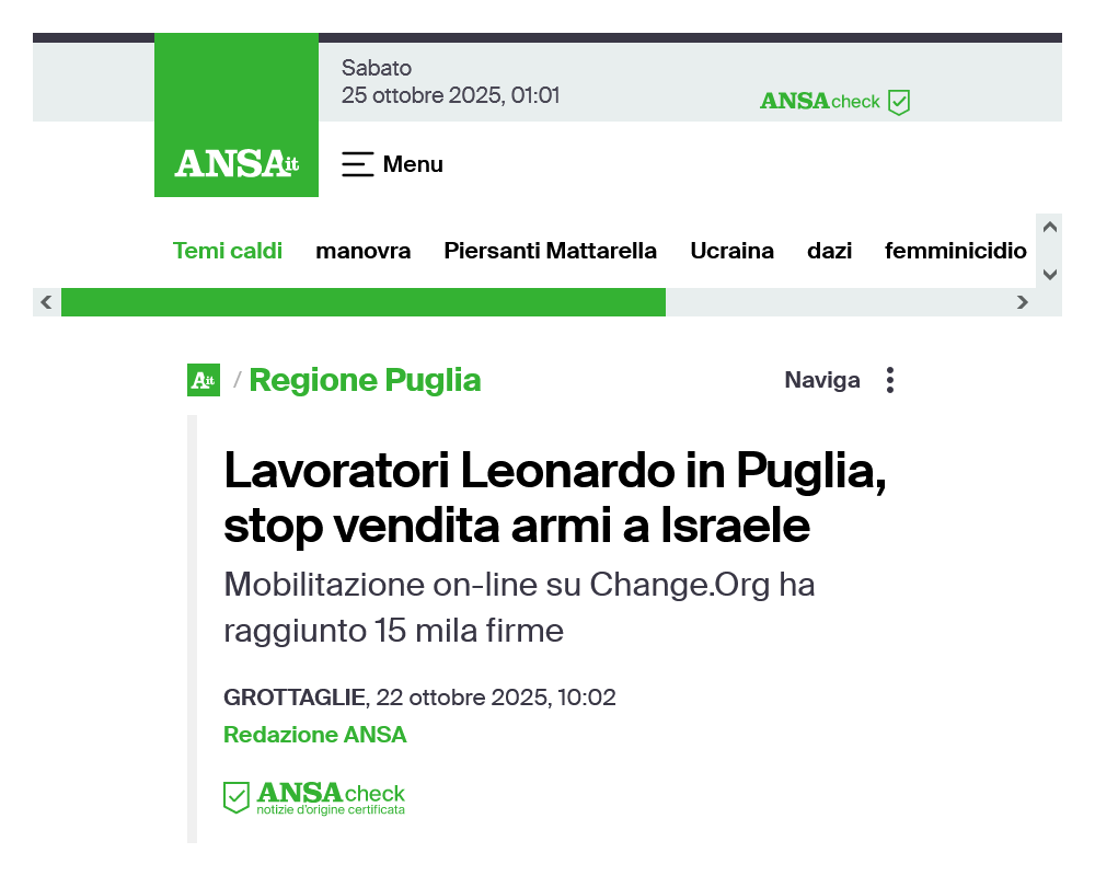 Diversi prodotti elencati nel paragrafo 2 di questo post ricadono nella casistica enunciata. 4 Concludendo. L'argomento posto è decisamente complicato da sbrogliare – questa mia sgrossata ha richiesto numerose ore di applicazione e ricerche – pertanto diversi punti sono spinnabili a favore di ciascuna delle parti in causa, ma la violazione dell'art. 185 è abbastanza chiara. Sulle carte di questo ed altri argomenti topici, tuttavia, dovrebbe prevalere la cosiddetta Ragione di Stato, ma la Repubblica Italiana è priva di una qualsivoglia, minima autonomia decisionale sia interna che estera. Si accettano considerazioni altre ed eventuali correzioni al testo. Al momento e letti i documenti allocati nelle Note, IMHO riassumo così il post per punti generali : art. 185 violato da Leonardo SpA, Cingolani bugiardo, e manifestanti comandati. = Note [1] : ''Lavoratori Leonardo in Puglia, stop vendita armi a Israele'', ANSA, 22 ottobre 2025, [ https://www.ansa.it/puglia/notizie/2025/10/22/lavoratori-leonardo-in-puglia-stop-vendita-armi-a-israele_e3cf5714-62ac-40b0-b333-b219cec01139.html ]. [2] : ''NON IN MIO NOME, NON CON IL MIO LAVORO'', Lavoratori Leonardo Grottaglie, Change[punto]org, 9 ottobre 2025, [ https://www.change.org/p/non-in-mio-nome-non-con-il-mio-lavoro-770c2714-9a6f-4e15-90c1-3460cb480142 ]. [3] : ''Archivio'', Marco Poli, VK, 25 ottobre 2025, [ https://vk.com/wall170191717_4719 ]; FB : [ https://www.facebook.com/Bufalo/posts/10238200448646676 ]; ODB : [ https://orlodelboccale.blogspot.com/2025/10/leonardo-spa.html ]. [4] : ''Cosa produce Leonardo per Israele'', The Weapon Watch, 26 gennaio 2024, [ https://www.weaponwatch.net/2024/01/26/cosa-produce-leonardo-per-israele/ ]; vedi : ''LEONARDO S.P.A.'', MarketScreener : [ https://it.marketscreener.com/quotazioni/azione/LEONARDO-S-P-A-162001/azienda/ ]. [5] : ''Importante mossa strategica di Leonardo nel mercato in rapida crescita della Force Protection: accordo per la fusione tra Leonardo DRS e RADA.'', comunicato stampa, Leonardo, 21 giugno 2022, [ https://www.leonardo.com/it/press-release-detail/-/detail/21-06-2022-important-strategic-move-by-leonardo-in-the-rapidly-growing-force-protection-market-leonardo-drs-and-rada-agree-to-an-all-stock-merger ]; vedi : DRS RADA Technologies, sito-web, [ https://www.drsrada.com/radars ]. [6] : ''Radar tattici multiruolo di DRS RADA Technologies per Israele'', Ares Osservatorio Difesa, 12 giugno 2023, [ https://aresdifesa.it/radar-tattici-multiruolo-di-drs-rada-technologies-per-israele/ ]; vedi : ''Israeli Defense Ministry selects Leonardo’s DRS RADA Technologies to supply tactical radar systems'', Israel Defense, 6 giugno 2023, [ https://www.israeldefense.co.il/en/node/58415 ]. [7] : ''Leonardo sbarca in Israele per spingere sull’innovazione'', Nicola Desiderio, Space Economy 360, 6 febbraio 2023, [ https://www.spaceconomy360.it/competenze-e-lavoro/leonardo-sbarca-in-israele-per-spingere-sullinnovazione/ ]; vedi : ''Leonardo, due partnership in Israele per favorire lo sviluppo di start up'', Leonardo, 3 febbraio 2023, [ https://www.leonardo.com/it/news-and-stories-detail/-/detail/leonardo-sole24ore-startup-partnership-israel ]; vedi : ''Leonardo sigla due accordi con Israeli Innovation Authority e Ramot Tel Aviv University nell’ambito dell’innovazione'', comunicato stampa, Leonardo, 3 febbraio 2023, [ https://www.leonardo.com/it/press-release-detail/-/detail/03-02-2023-leonardo-signs-two-agreements-with-israeli-innovation-authority-and-ramot-tel-aviv-university-in-the-field-of-innovation ]. [8] : ''DRS Sustainment Systems'', HigherGov, [ https://www.highergov.com/awardee/drs-sustainment-systems-inc-10107801/ ]; SOSSEC : [ https://sossecinc.com/company/drs-sustainment-systems-llc/ ]; WIki ITA : ''Leonardo DRS'', AA. VV., [ https://it.wikipedia.org/wiki/Leonardo_DRS ]; vedi : Leonardo DRS, sito-web, [ https://www.leonardodrs.com/ ]. [9] : ''Leonardo DRS Awarded Contract to Build Advanced Heavy Duty Tank Trailers'', Leonardo DRS, 6 maggio 2020, [ https://www.leonardodrs.com/news/press-releases/leonardo-drs-awarded-contract-to-build-advanced-heavy-duty-tank-trailers/ ]. [10] : ''In arrivo in Israele i mezzi militari ordinati agli Stati Uniti'', Antonio Mazzeo, Pagine Esteri, 30 settembre 2024, [ https://pagineesteri.it/2024/09/30/medioriente/in-arrivo-in-israele-i-mezzi-militari-ordinati-agli-stati-uniti/ ]; vedi : ''Contracts For Dec. 27, 2023'', U.S. Department of War, [ https://www.war.gov/News/Contracts/Contract/Article/3627236/ ]. [11] : al momento in cui scrivo, risultano 128 transazioni dai vari dipartimenti federali USA a DRS Sustainment Systems negli ultimi 12 mesi, per un ammonto di 141,6M $; e 3.503 transazioni totali, per un ammonto di 3,4G $; vedi : ''DRS SUSTAINMENT SYSTEMS INC'', USAspending, [ https://www.usaspending.gov/recipient/69e0bc60-3c33-981b-b6f2-080ec54f14f0-C/latest ]. [12] : ''Early 76mm/62 Naval Guns of the Marina Militare Italiana'', Phoenix_jz, Secret Projects, 24 ottobre 2024, [ https://www.secretprojects.co.uk/threads/early-italian-76-62s-of-the-1950s.44626/ ]; vedi : ''Oto Melara Introduces a 76mm Version of Vulcano Multi-Mission, Long Range Naval Projectile Technology'', Tamir Eshel, Defense Update, 28 settembre 2011, [ https://defense-update.com/20110928_oto-melara-introduces-a-76mm-version-of-vulcano-multi-mission-long-range-naval-projectile-technology.html ]; vedi : ''Leonardo’s 76/62 mm Super Rapido: the full spectrum medium artillery'', EDR, 11 luglio 2020, [ https://www.edrmagazine.eu/leonardos-76-62-mm-super-rapido-the-full-spectrum-medium-artillery ]; vedi : ''Oto Melara 76 Super Rapid Compact Naval Gun'', Dark Seas, YouTube, 3 ottobre 2022, [ https://www.youtube.com/watch?v=mn51wKAeApA ]. [13] : ''76/62 Super Rapid'', Deagel, [ https://www.deagel.com/Components/7662%20Super%20Rapid/a002149 ]; Seaforces[punto]org : [ https://www.seaforces.org/wpnsys/SURFACE/Oto-Melara-76mm-compact-super-rapid.htm ]; NavWeaps : [ http://www.navweaps.com/Weapons