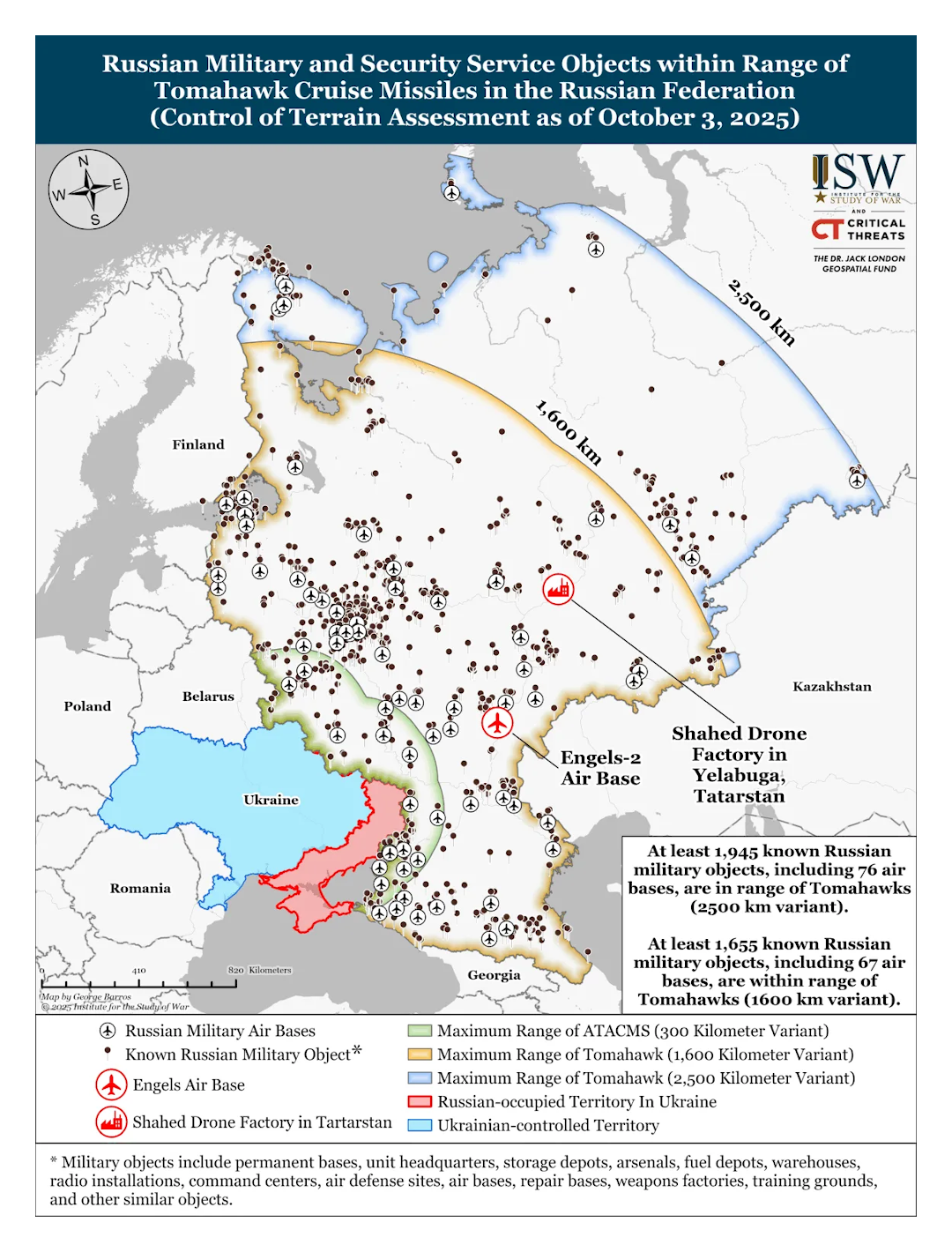Cartina geografica delle gittate degli ATACMS ( in verde ), delle varie versioni dei missili Tomahawk ( giallo, e azzurro ), e degli obiettivi sul territorio della Federazione Russa – Institute for the Study of War [7].