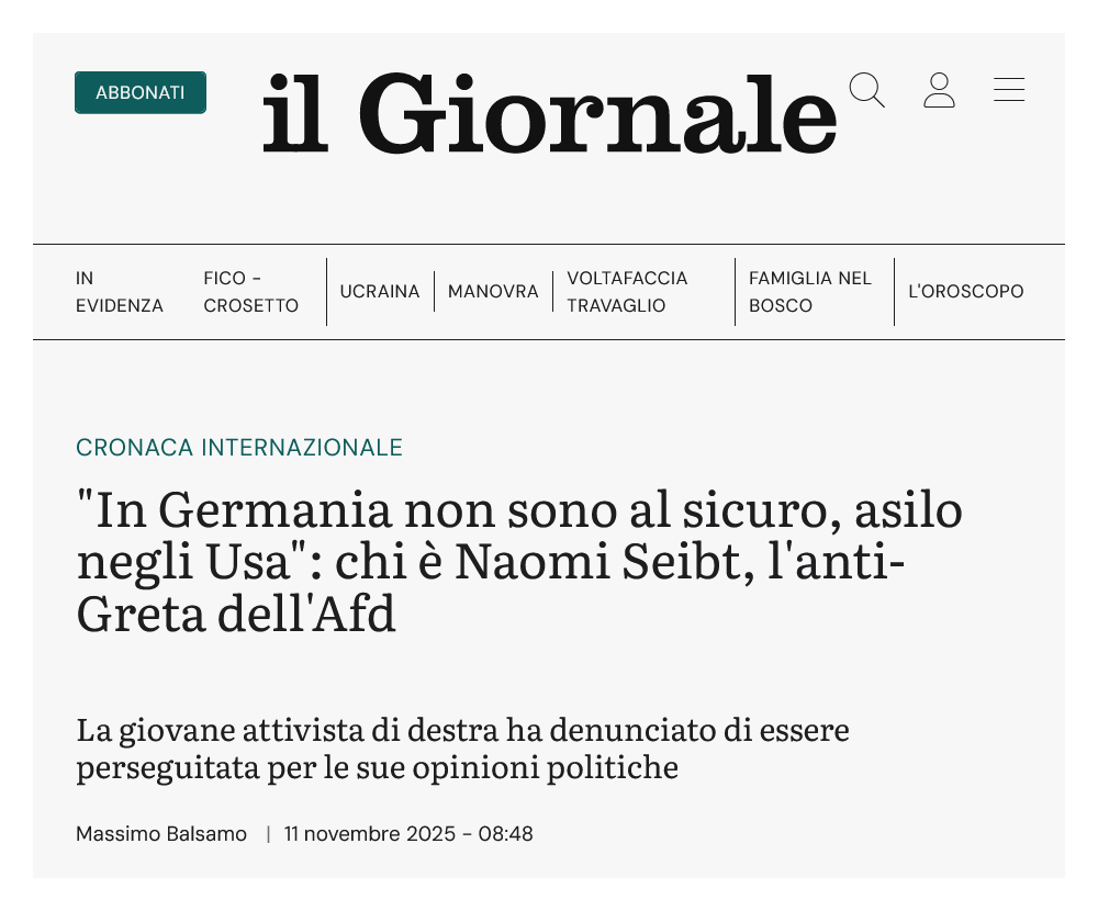1 Breve : ● prendiamo atto che la progressiva frammentazione dell'area oppositiva procede alla grande, secondo le volontà dei Padroni : ciò che la resistenza alla costruzione psico-pandemica aveva unito, oramai non esiste più e si è tornati alle patetiche etichette ''di destra'' e ''di sinistra'', mentre il confronto è più che mai verticale, tra ''l'alto'' e ''il basso''; un particolare riconoscimento va al popolo dessinistra che non ha saputo resistere alla tentazione malinconica di tirare fuori dal cassetto la kefiah stirata dalla mamma [2]; ● da parecchi mesi, la Federazione Russa offre una sorta di asilo politico ai cittadini ovest-europei vessati da una finta democrazia che sospinge valori e politiche disumane, e limita progressivamente e inesorabilmente gli spazi per l'espressione del proprio pensiero, se non allineato ai concetti e alle forme della narrazione ufficiale = padronale, consistente in un visto della durata di 3 anni, procrastinabili nel caso dell'avvio di un'attività lavorativa in loco [3][4]; ora, anche gli Stati Uniti d'America offriranno l'asilo politico ai cittadini ovest-europei. Tra le due super-potenze c'è un'Ovest-Europa sempre più degradata e demente, che, guidata da una combriccola di piccoli burocrati verminosi e venduti, cammina decisa verso la propria estinzione. Al netto delle dietrologie possibili sul personaggio definito ''l'anti-Greta'', la ragazza tedesca fa bene a lasciare questa terra di smemorizzati allo sbando ED è l'ennesimo campanello d'allarme per chi ha ancora le orecchie e, collegato, un cervello funzionante. = Note [1] : ''"In Germania non sono al sicuro, asilo negli Usa": chi è Naomi Seibt, l'anti-Greta dell'Afd'', Massimo Balsamo, il Giornale, 11 novembre 2025, [ https://www.ilgiornale.it/news/cronaca-internazionale/germania-non-mi-sento-sicuro-lanti-greta-dellafd-chiede-2566001.html ]; vedi : ''Naomi Seibt, l'attivista "anti Greta" che spiazza gli ambientalisti'', Gianluca Prestopino, il Giornale, 27 febbraio 2020, [ https://www.ilgiornale.it/news/motori/naomi-seibt-lattivista-anti-greta-che-spiazza-ambientalisti-1832557.html ]. [2] : annoto al volo i freschi danni a cose e persone causati dai fanatici propal convenuti a Bologna per ostacolare la partita di basket di Eurolega tra Virtus e Maccabi Tel Aviv; vedi : ''Corteo Pro Pal, scontri con la polizia. 16 agenti feriti, 15 manifestanti identificati'', TGR Emilia-Romagna, Rai News, 21–22 novembre 2025, [ https://www.rainews.it/tgr/emiliaromagna/maratona/2025/11/la-partita-della-tensione-partita-la-manifestazione-pro-pal-contro-virtus-maccabi-tel-aviv-862ce7bb-3466-40d0-9e66-ce917e340efc.html ]. [3] : ''Putin vara decreto che offre asilo a chi scappa dalle "ideologie neoliberali distruttive"'', Sky TG24, 21 agosto 2024, [ https://tg24.sky.it/mondo/2024/08/21/russia-putin-decreto-asilo-occidentali ]. [4] : ''Visto dei Valori Condivisi: Guida Passo dopo Passo per Trasferirti in Russia'', Irena Domingo, Rusalia, 22 aprile 2025, [ https://rusalia.it/visto-valori-condivisi-russia/ ]; vedi : ''Указ Президента Российской Федерации от 19.08.2024 № 702 "Об оказании гуманитарной поддержки лицам, разделяющим традиционные российские духовно-нравственные ценности"'' ( ''Decreto del Presidente della Federazione Russa del 19 agosto 2024, n. 702 "Sulla fornitura di sostegno umanitario a individui che condividono i valori spirituali e morali tradizionali russi"'' ), Официальное опубликование правовых актов ( Pubblicazione ufficiale degli atti giuridici ), Federazione Russa, [ http://publication.pravo.gov.ru/document/0001202408190001 ]. === --- { prima pubblicazione del post su VK, il 22 novembre 2025 [5]; su FB : [6] }. |