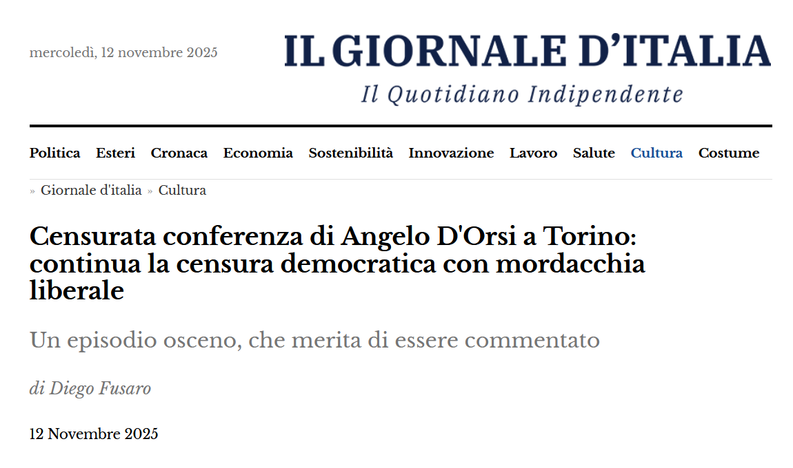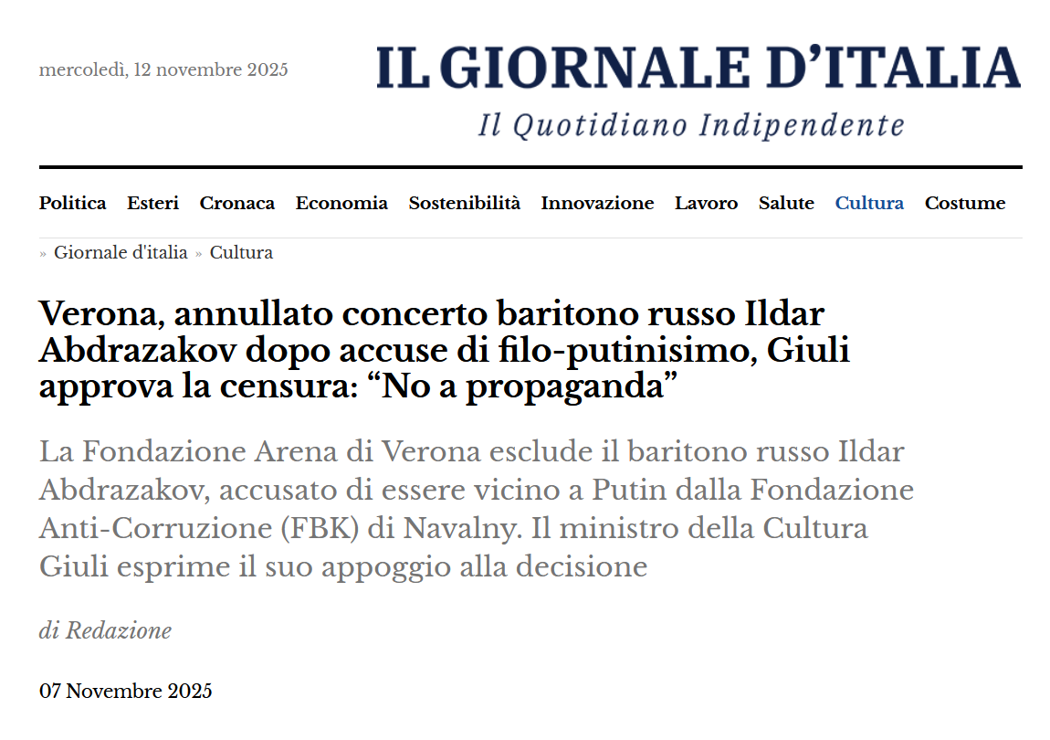 Il prof. d'Orsi ha commentato duramente l'azione arbitraria e censoria agita ai suoi danni, e l'evento è stato spostato al Circolo La Poderosa, sempre in data odierna, ma alle ore 21 { [29][30][31]... }. Al pariolino non è andato giù il semplice spostamento della sede, e sembra volere proprio togliere al prof. d'Orsi il diritto di parola. Ha convocato i russofobici del suo partitello ( Azione ) in Piazza Carignano, alle 18 ( bene, li conteremo )[32] supportato dalla compare [33] e iniziato a fare gazzarra con i sostenitori del prof. [34]. 13 novembre La manifestazione russofobica di Piazza Carignano è stata un flop, nonostante il supporto di molte sigle ( Europa Radicale, Azione, Comunità Ucraina Torino, Italia Viva e +Europa )[35] e la Picierno in collegamento da remoto [36]. Leggo di un'ottantina di partecipanti, ma nelle foto dispacciate dal mainstream sembrano molti meno, nemmeno la metà. Al contrario, alla conferenza tenutasi al circolo sociale erano presenti circa 500 persone tra coloro che hanno trovato posto all'interno e quelli che, all'esterno, hanno potuto ascoltarla grazie a degli altoparlanti [37], più altre centinaia collegate nella diretta su Facebook [38]. All'inizio della conferenza, il prof. d'Orsi ha denunciato di avere subìto il cracking dei propri account social e anche di quello PayPal, con furto di denaro, nelle ore immediatamente precedenti, e che c'è stato un tentativo di effrazione dell'entrata del circolo durante la notte [38]. = Note [1] : ''Notizie'', Marco Poli, VK, 11 novembre 2025, [ https://vk.com/wall170191717_4746 ]; FB : [ https://www.facebook.com/Bufalo/posts/pfbid037uUmnsrFxnUSSQomcTjzyUkNaAzS7ttUPGgkkHUFkj9YAG39uCcVjyGc2AtG9Pftl ]; ODB : [ https://orlodelboccale.blogspot.com/2025/11/ruukrnnn-slava-parioli.html ]. [2] : ''Notizie'', Marco Poli, VK, 13 gennaio 2025, [ https://vk.com/wall170191717_4151 ]; FB : [ https://www.facebook.com/Bufalo/posts/10234575262539289 ]; ODB : [ https://orlodelboccale.blogspot.com/2025/01/ruukrnnn-villa-paradiso-e-sotto-attacco.html ]. [3] : ''Notizie'', Marco Poli, VK, 20 gennaio 2025, [ https://vk.com/wall170191717_4169 ]; FB : [ https://www.facebook.com/Bufalo/posts/10234613642818772 ]; ODB : [ https://orlodelboccale.blogspot.com/2025/01/ruukrnnn-chiuso-il-conto-corrente.html ]. [4] : ''Notizie'', Marco Poli, VK, 18 febbraio 2025, [ https://vk.com/wall170191717_4216 ]; FB : [ https://www.facebook.com/Bufalo/posts/10234809369871826 ]; ODB : [ https://orlodelboccale.blogspot.com/2025/02/ruukrnnn-chiuso-il-conto-corrente-di.html ]. [5] : ''Articolo 21'', La Costituzione, Senato della Repubblica, [ https://www.senato.it/istituzione/la-costituzione/parte-i/titolo-i/articolo-21 ]. [6] : Ildar Abdrazakov, I nostri artisti, Fondazione Arena di Verona, [ https://www.arena.it/artisti/ildar-abdrazakov/ ]; Operabase : [ https://www.operabase.com/ildar-abdrazakov-a7248/it ]; Wiki ENG : [ https://en.wikipedia.org/w/index.php?title=Ildar_Abdrazakov&oldid=1308779083 ]; Wiki RUS : [ https://ru.wikipedia.org/wiki/%D0%90%D0%B1%D0%B4%D1%80%D0%B0%D0%B7%D0%B0%D0%BA%D0%BE%D0%B2,_%D0%98%D0%BB%D1%8C%D0%B4%D0%B0%D1%80_%D0%90%D0%BC%D0%B8%D1%80%D0%BE%D0%B2%D0%B8%D1%87 ]. [7] : Ildar Abdrazakov, sito-web, [ http://ildarabdrazakov.com/ ]; FB #1 : [ https://www.facebook.com/iabdrazakov/ ]; FB #2 : [ https://www.facebook.com/groups/1863538096989541/ ]; IG : [ https://www.instagram.com/ildarabdrazakov/ ]; X : [ https://x.com/IldarAbdrazakov ]; YT : [ https://www.youtube.com/channel/UCI93cBbQ_t_Fm6jU_BBvO9g ]. [8] : ''Verona, annullato concerto baritono russo Ildar Abdrazakov dopo accuse di filo-putinisimo, Giuli approva la censura: “No a propaganda”, Il Giornale d'Italia, 7 novembre 2025, [ https://www.ilgiornaleditalia.it/news/cultura/747485/verona-annullato-concerto-baritono-russo-ildar-abdrazakov-dopo-accuse-di-filo-putinisimo-giuli-approva-la-censura-no-a-propaganda.html ]; vedi : comunicato stampa, Fondazione Arena di Verona, 6 novembre 2025, [ https://www.arena.it/magazine/news/abdrazakov-non-si-esibira-al-teatro-filarmonico-di-verona-nel-2026/ ]. [9] : ''Concerto del cantante russo Abdrazakov a Verona, fondazione Navalny chiede la censura: "Non fatelo esibire, è filoputiniano"'', Il Giornale d'Italia, 6 novembre 2025, [ https://www.ilgiornaleditalia.it/news/politica/746959/concerto-del-cantante-russo-abdrazakov-a-verona-fondazione-navalny-chiede-la-censura-non-fatelo-esibire-e-filoputiniano.html ]; vedi : post, The Anti-Corruption Foundation, X, 6 novembre 2025, [ https://x.com/ACF_int/status/1986445708887462186 ]. [10] : ''Notizie, e Archivio'', Marco Poli, VK, 21 febbraio 2024, [ https://vk.com/wall170191717_3633 ]; FB : [ https://www.facebook.com/Bufalo/posts/10231243905657449 ]; ODB : [ https://orlodelboccale.blogspot.com/2024/02/ruukrnnn-game-over-per-navalnyj.html ]. [11] : ''Giuli: "Bene annullamento esibizione Abdrazakov a Verona"'', comunicato stampa, Ministero della Cultura, 6 novembre 2025, [ https://cultura.gov.it/comunicato/28216 ]. [12] : post, Pina Picierno, X, 5 novembre 2025, [ https://x.com/pinapic/status/1986158623110660538 ]; vedi : post, Carlo Calenda, X, 5 novembre 2025, [ https://x.com/CarloCalenda/status/1986172144598876299 ]. [13] : post, Pina Picierno, X, 6 novembre 2025, [ https://x.com/pinapic/status/1986435139740577867 ]. [14] : post, Yulia Navalnaya, X, 6 novembre 2025, [ https://x.com/yulia_navalnaya/status/1986464130069377065 ]. [15] : post, Ukr Embassy to Italy, X, 6 novembre 2025, [ https://x.com/UKRinIT/status/1986468356774330532 ]. [16] : ''Verona dice no a Abdrazakov'', Stefano Nardelli, Il Giornale della Musica, 7 novembre 2025, [ https://www.giornaledellamusica.it/news/verona-dice-no-a-abdrazakov ]; vedi : ''Putin’s Ally, Not Don Juan'', Anti-Corruption Foundation ( ACF ), [ https://fbk.info/en/campaigns/abdrazakov ]. [17] : ''Ildar Abdrazakov escluso dal Don Giovanni, il baritono vicino a Putin non canterà a Verona: la vicinanza a Putin e la villa di lusso in Toscana'', Alba Romano, Ope