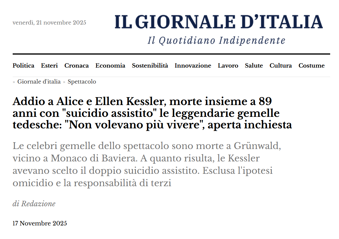 Notizie, e Commento di Marco Poli L'eutanasia è una parola di origine greca ( εὐϑανασία ) composta da ''bene'' ( εὖ ) e morte ( ϑάνατος ) e indica il porre deliberatamente termine a questa vita terrena di un essere umano al fine di preservarlo da future e certe sofferenze [1][2]. Il doppio suicidio assistito delle gemelle Alice ed Ellen Kessler { [3]...[4][5]...[6]...[10]... } ha riaperto la discussione morale ed etica sulla pratica, con miei contatti e canali dell'area oppositiva che si sono dichiarati contrari. La mia opinione è differente. 1 Durante il biennio psico-pandemico, il pilastro della narrazione mainstream fu la conservazione della mera vita biologica ad ogni costo individuale, economico, e sociale. Gli anziani furono messi al centro di tale retorica siccome ''soggetti più fragili'' che andavano ''impacchettati col cellophane'' e protetti da qualsiasi altro essere umano, soprattutto se giovane. Nulla importava di più, e vennero così cancellati i rapporti affettivi con figli e nipoti agendo un terrorismo mediatico sui pranzi in famiglia ( persino quello natalizio, e il cenone di Capodanno ), i bambini grandi diffusori dei virus, eccetera. Alla retorica mass-mediatica venne associata sinergicamente una pletora di regolamenti che vivisezionavano ed amputavano capillarmente la vita sociale ed affettiva. Gli anziani malati vennero separati dalle famiglie, a lungo impossibilitate a un contatto fisico nei luoghi di cura. Poi, altre pressioni e coercizioni psicologiche e normative vennero introdotte e agite con l'arrivo delle brodaglie sperimentali dette ''vaccini anti-Covid''. Ancora, gli anziani erano in prima linea siccome ''soggetti più fragili'' assolutamente bisognosi della millantata copertura immunitaria supplementare. Lo spazio narrativo veniva riempito con ogni sorta di esempio, finanche parossistico [11]. In soldoni, doveva essere fatto di tutto e di più – e spesso a danno dei più giovani – pur di allungare la vita di qualche mese a soggetti ultra-ottantenni magari già affetti da 4, 5 patologie serie e gravi. 2 Credo che le gemelle abbiano scelto il comportamento esattamente opposto. All'età di 89 anni e di fronte al declino della salute psico-fisica di una delle due ( Ellen ), hanno lucidamente scelto di lasciare il palcoscenico di questa vita e di passare alla prossima assieme, mano nella mano, prima che l'umana degenerazione affliggesse e deturpasse entrambe. Hanno deciso almeno un anno fa, ed è stata una scelta anche altruistica : piuttosto che consumare il loro patrimonio – ho letto di 15M € – in cure mediche assistenziali progressive tra casa e ospedale, il cui confine con l'accanimento terapeutico è assai labile, hanno preferito lasciarlo a varie associazioni di beneficenza. Concordo. Credo che spetti solo all'individuo la decisione di continuare oppure di porre termine a quest'esperienza terrena, nel momento in cui la propria prospettiva non solo di vita ma di una vita pienamente dignitosa si restringe. Solo all'individuo, non a un dio, non allo Stato, né ad altro ente. = Note [1] : ''Eutanaṡìa'', Vocabolario on line, Treccani, [ https://www.treccani.it/vocabolario/eutanasia/ ]; vedi : ''Eutanasia'', Enciclopedia on line, Treccani, [ https://www.treccani.it/enciclopedia/eutanasia/ ]. [2] : ''Suicidio assistito: ecco come funziona in Europa. In Germania si può ma "a determinate condizioni"'', Rai News, 18 novembre 2025, [ https://www.rainews.it/articoli/2025/11/suicidio-assistito-europa-germania-condizioni-eutanasia-scheda-gemelle-kessler-ef56232f-6600-4170-a515-857768b59f3c.html ]. [3] : ''Gemelle Kessler'', AA. VV., Wikipedia ITA, [ https://it.wikipedia.org/w/index.php?title=Gemelle_Kessler&oldid=148111860 ]; vedi : ''File:Kessler Twins 1966.JPG'', Wikimedia Commons, [ https://commons.wikimedia.org/w/index.php?title=File:Kessler_Twins_1966.JPG&oldid=973727919&uselang=it ]. [4] : ''Addio a Alice e Ellen Kessler, morte insieme a 89 anni con "suicidio assistito" le leggendarie gemelle tedesche: "Non volevano più vivere", aperta inchiesta'', Il Giornale d'Italia, 17 novembre 2025, [ https://www.ilgiornaleditalia.it/news/spettacolo/750271/addio-a-alice-ed-ellen-kessler-morte-insieme-a-89-anni-le-leggendarie-gemelle-tedesche-note-per-da-da-umpa-e-la-notte-e-piccola-per-noi-aperta-inchiesta.html ]. [5] : ''Gemelle Kessler, vita, arte e morte di un duo iconico e rivoluzionario: i turbamenti erotici di un paese felice e in bianco e nero'', Maurizio De Caro, Il Giornale d'Italia, 19 novembre 2025, [ https://www.ilgiornaleditalia.it/news/spettacolo/750976/gemelle-kessler-vita-arte-e-morte-di-un-duo-iconico-e-rivoluzionario-i-turbamenti-erotici-di-un-paese-felice-e-in-bianco-e-nero.html ]. [6] : ''L'intervista in cui Ellen e Alice Kessler dissero: «Vorremmo morire lo stesso giorno»'', Chiara Maffioletti, Corriere della Sera, 17 novembre 2025, [ https://www.corriere.it/spettacoli/25_novembre_17/intervista-gemelle-kessler-morire-stesso-giorno-1a477229-e2ed-4a5a-b161-f3aae3d3exlk.shtml ]. [7] : ''Kessler, gli ultimi giorni: l'addio preparato nei dettagli, la lettera per disdire l'abbonamento alla rivista, i gioielli inviati all'amica'', Mara Gergolet, Corriere della Sera, 19 novembre 2025, [ https://www.corriere.it/spettacoli/25_novembre_19/kessler-ultimi-giorni-rivista-edb8bb04-48c9-484f-8b84-6498eae70xlk.shtml ]. [8] : ''Così sono morte le gemelle Kessler: "Si sono iniettate una dose letale assistite da un medico e un legale"'', Tgcom24, 19 novembre 2025, [ https://www.tgcom24.mediaset.it/televisione/gemelle-kessler-morte-data-urna-eredita_106133673-202502k.shtml ]. [9] : ''Gemelle Kessler, svelato quanto hanno pagato per il suicidio assistito'', Corriere dello Sport, 21 novembre 2025, [ https://www.corrieredellosport.it/news/attualit/2025/11/21-144721842/gemelle_kessler_svelato_quanto_hanno_pagato_per_il_suicidio_assistito ]. [10] : ''Patrimonio gemelle Kessler: dai risparmi alla loro casa, a chi va l’eredità milionaria d