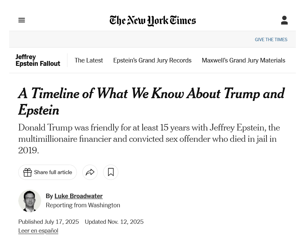 Mah. Vedo parecchia ambizione ed arrivismo in ogni protagonista di quella storia. Non mi risulta che le ragazze venissero rapite per poi lavorare nei resort dell'isola. 2 Nel corso degli anni, sono state pubblicate online varie cartelle di documenti sul caso { ...[9]...[10][11]... }. Durante la campagna elettorale del 2024, Donald Trump aveva promesso più volte che, se eletto, avrebbe dato l'ordine di declassificare tutti i file del Caso Epstein ( nonché quelli su JFK e sul 9/11 ) che, così, sarebbero potuti essere pubblicati per intero [12][13][14]. Entrato in carica nel gennaio di quest'anno, ha tergiversato fino a innervosire la base MAGA ( Make America Great Again ) che era stata per lungo tempo infuocata con il complotto della cosiddetta ''idola dei pedofili'', definizione erronea siccome non mi pare che vi abbiano lavorato femmine minori di 14 anni, ma ripresa anche dalla controinformazione nostrana. E' stato solo mercoledì 12 novembre, che la Legge sulla trasparenza dei file del caso Epstein ( in lingua inglese : Epstein Files Transparency Act )[15] ha avuto la prima votazione positiva, dopo la quale sarebbe stata vagliata dalle camere del Parlamento federale ( Casa dei rappresentanti e Senato ). Lo stesso giorno, i componenti dem* del Comitato per la vigilanza e la riforma del governo ( Committee on Oversight and Government Reform ) hanno anticipato la tempistica e fatto uno sgarro al Pres. in carica, pubblicando tre corrispondenze tra Epstein e Ghislaine Maxwell ( 1 ), e tra Epstein e Michael Wolff ( 2 ), nelle quali viene citato Trump come persona al corrente del sistema vigente sull'isola [16]. Immediatamente, il comitato a maggioranza repubblicana ha replicato con larga trasparenza, pubblicando circa 20k pagine di documenti [17]. La legge è stata approvata dalla camera bassa il 18 novembre, dal Senato il giorno successivo, ed è stata subito firmata da Trump [18] dopo avere polemizzato con i dem* [19]. Tutti i fascicoli relativi al procedimento penale nei confronti del defunto – suicida, oppure suicidato in carcere ? – finanziere e magnaccia dovranno essere pubblicati entro 30 giorni dall'approvazione, declassificandoli nella misura necessaria, e la lista completa delle persone coinvolte dovrà essere trasmessa al comitato. La scadenza è venerdì 19 dicembre. Vedremo. 3 Allego alcuni commenti audiovisivi alla vicenda { [20]...[21][22]... }. = Note [1] : ''Democrats Release Photos Showing Epstein Ties to Powerful Men'', Michael Gold, The New York Times, 12 dicembre 2025, [ https://www.nytimes.com/2025/12/12/us/politics/jeffrey-epstein-photos-estate.html ]. [2] : ''Nuove foto da casa Epstein, spuntano pacchetti di condom con il volto di DonaldTrump'', Alessandra Baldini, ANSA, 13 dicembre 2025, [ https://www.ansa.it/sito/notizie/mondo/2025/12/12/nuove-foto-da-casa-epstein-spuntano-pacchetti-di-condom-con-il-volto-di-donaldtrump_5cceaf0e-1c73-4c7f-abb0-38dbc529ba6b.html ]; FB : [ https://www.facebook.com/story.php?story_fbid=1330804592416710&id=100064615457043 ]. [3] : ''Epstein scandal'', AA. VV., Wikipedia ENG, [ https://en.wikipedia.org/wiki/Epstein_scandal ]. [4] : trad. da ''A Timeline of What We Know About Trump and Epstein'', uke Broadwater, The New York Times, 17 luglio 2025, [ https://www.nytimes.com/2025/07/17/us/politics/timeline-trump-epstein.html ]. [5] : ''Little Saint James'', AA. VV., Wikipedia ENG, [ https://en.wikipedia.org/w/index.php?title=Little_Saint_James&oldid=1325946777 ]. [6] : ''L’isola di Epstein al setaccio, caccia alla cassaforte'', SWI, 14 agosto 2019, [ https://www.swissinfo.ch/ita/l-isola-di-epstein-al-setaccio-caccia-alla-cassaforte/45161874 ]. [7] : ''Democrats Release Images of Epstein’s Private Home'', Michael Gold, The New York Times, 3 dicembre 2025, [ https://www.nytimes.com/2025/12/03/us/politics/epstein-island-home.html ]. [8] : fonte #4. [9] : ''Here are all the "Epstein files" that have been released — and which haven't'', Herb Scribner, Axios, 12 novembre 2025, [ https://www.axios.com/2025/11/12/new-epstein-files-emails-released-doj-trump ]. [10] : ''Government exhibit 662-RR", { PDF }, [ https://s3.documentcloud.org/documents/25547062/epstein-documents.pdf ]. [11] : ''Oversight Committee Releases Records Provided by the Epstein Estate, Chairman Comer Provides Statement'', Committee on Oversight and Government Reform, 8 settembre 2025, [ https://oversight.house.gov/release/oversight-committee-releases-records-provided-by-the-epstein-estate-chairman-comer-provides-statement/ ]; { PDF } : [ https://drive.google.com/drive/folders/1ZSVpXEhI7gKI0zatJdYe6QhKJ5pjUo4b ]. [12] : ''What Trump has said about Jeffrey Epstein over the years, including on 2024 campaign trail'', Alexandra Hutzler, ABC, 16 luglio 2025, [ https://abcnews.go.com/Politics/trump-jeffrey-epstein-years-including-2024-campaign-trail/story?id=123778541 ]. [13] : post, Trump War Room, X, 3 giugno 2024, [ https://x.com/TrumpWarRoom/status/1797720117737865557 ]. [14] : ''Transcript for Donald Trump Interview | Lex Fridman Podcast #442'', Lex Fridman, ( 3 settembre 2024 ), [ https://lexfridman.com/donald-trump-transcript/ ]. YT : [ https://www.youtube.com/watch?v=qCbfTN-caFI ]. [15] : ''Epstein Files Transparency Act'', AA. VV., Wikipedia ENG, [ https://en.wikipedia.org/w/index.php?title=Epstein_Files_Transparency_Act&oldid=1326419430 ]; vedi : ''H.R.4405 - Epstein Files Transparency Act'', Library of Congress ( Biblioteca del Congresso ), [ https://www.congress.gov/bill/119th-congress/house-bill/4405 ]; { PDF } : [ https://www.congress.gov/119/plaws/publ38/PLAW-119publ38.pdf ]. [16] : ''Trump Named in Epstein Emails Released by Democrats and Republicans'', AA. VV., The New York Times, 12 novembre 2025, [ https://www.nytimes.com/live/2025/11/12/us/epstein-files-trump ]; vedi : ''House Oversight Committee Releases Jeffrey Epstein Email Correspondence, Raising Questions About White House Coverup of Epstein Files'', Oversight Democrats, 12 novembre 2025, [ https://o
