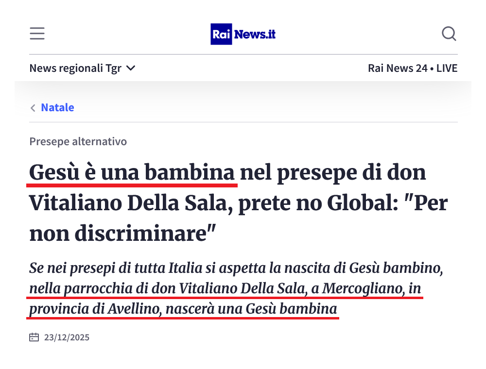 2 Consiglio i commenti di Alessandro Bonelli [7] e Diego Fusaro [8]. = Note [1] : ''Parrocchia di Santi Pietro e Paolo'', Diocesi di Avellino, [ https://www.diocesiavellino.it/parrocchia-santi-pietro-paolo-3/ ]. [2] : ''Notizie'', Marco Poli, VK, 24 dicembre 2023, [ https://vk.com/wall170191717_3550 ]; FB : [ https://www.facebook.com/Bufalo/posts/10230935054736369 ]; ODB : [ https://orlodelboccale.blogspot.com/2023/12/bestiario-natalizio-sono-stanco.html ]. [3] : ''Gesù è una bambina nel presepe di don Vitaliano Della Sala, prete no Global: "Per non discriminare"'', Rai News, 23 dicembre 2025, [ https://www.rainews.it/articoli/2025/12/-gesu-e-una-bambina-nel-presepe-di-don-vitaliano-della-sala-prete-no-global-per-non-discriminare-6c19c51b-f75b-464d-87dc-d67dcbf08724.html ]. [4] : ''Eresia'', Enciclopedia on line, Treccani, [ https://www.treccani.it/enciclopedia/eresia/ ]. [5] : ''Codice di diritto canonico'', La Santa Sede, [ https://www.vatican.va/archive/cod-iuris-canonici/cic_index_it.html ]; vedi : ''Codex iuris canonici'', Enciclopedia on line, Treccani, [ https://www.treccani.it/enciclopedia/codex-iuris-canonici/ ]; Wiki ITA : [ https://it.wikipedia.org/w/index.php?title=Codice_di_diritto_canonico&oldid=148438019 ]. [6] : ''La funzione d'insegnare della Chiesa'', Libro III, Codice di diritto canonico, La Santa Sede, [ https://www.vatican.va/archive/cod-iuris-canonici/ita/documents/cic_libroIII_747-755_it.html ]; vedi : ''I delitti contra fidem, aspetti sostanziali e procedurali'', Maria Cives, Vox Canonica, 29 ottobre 2021, [ https://www.voxcanonica.com/2021/10/29/i-delitti-contra-fidem-aspetti-sostanziali-e-procedurali/ ]. [7] : ''Gesù bambin@, la kefiah e l’arcobaleno: questo presepe merita l’autocombustione'', Alessandro Bonelli, Nicola Porro, 24 dicembre 2025, [ https://www.nicolaporro.it/gesu-bambin-la-kefiah-e-larcobaleno-questo-presepe-merita-lautocombustione/ ]. [8] : ''Arriva il presepe con Gesù bambina: il trionfo del pensiero unico politicamente e teologicamente corretto'', Diego Fusaro, Il Giornale d'Italia, 25 dicembre 2025, [ https://www.ilgiornaleditalia.it/news/cultura/759801/arriva-il-presepe-con-gesu-bambina-il-trionfo-del-pensiero-unico-politicamente-e-teologicamente-corretto.html ]. === --- { prima pubblicazione del post su VK, il 28 dicembre 2025 [9]; su FB : [10] }. |