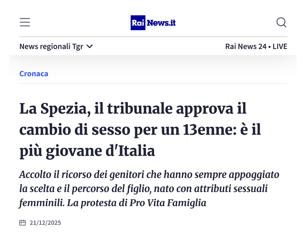 Vedremo. = Note [1] : ''La Spezia, il tribunale approva il cambio di sesso per un 13enne: è il più giovane d'Italia'', Rai News, 21 dicembre 2025, [ https://www.rainews.it/articoli/2025/12/la-spezia-cambio-di-sesso-per-13enne-e-il-piu-giovane-ditalia--c09eeafe-e729-4188-bd75-c1aa028017a7.html ]; vedi : ''Cambia sesso a 13 anni, il via libera del tribunale al nuovo nome dopo la terapia ormonale: «Il più giovane d'Italia. Percorso consapevole»'', Alessandro Fulloni, Corriere della Sera, 21 dicembre 2025, [ https://www.corriere.it/cronache/25_dicembre_21/cambio-sesso-13-anni-la-spezia-4c3b9163-50ce-460b-a0d5-597861c73xlk.shtml ]; vedi : [ https://archive.md/Xfg1V ]. [2] : farmaco peptidico sintetico, analogo dell'ormone GnRH, che sopprime la produzione di ormoni sessuali ( testosterone, estrogeni ) agendo sull'ipofisi, usato per trattare tumori ormono-dipendenti ( prostata, seno ), endometriosi, fibromi uterini, pubertà precoce, e in fecondazione assistita; da Google AI. [3] : ''Cambia sesso a 13 anni da femmina a maschio: è il più giovane d’Italia. “Percorso consapevole”: il tribunale accoglie la richiesta dei genitori'', Martina Del Chicca, La Nazione, 21 dicembre 2025, [ https://www.lanazione.it/la-spezia/cronaca/cambia-sesso-a-13-anni-bwsa99g3 ]. [4] : ''Cosa ha detto il Comitato nazionale per la bioetica sull'uso della triptorelina per la disforia di genere'', Marta Musso, Wired ITA, 18 dicembre 2024, [ https://www.wired.it/article/triptorelina-farmaco-blocco-puberta-disforia-genere-comitato-bioetica-parere/ ]; vedi : ''COMUNICATO STAMPA CNB n. 6/2024 del 16 dicembre 2024'', Comitato nazionale per la bioetica, Presidenza del Consiglio dei Ministri, { PDF }, [ https://bioetica.governo.it/media/kxndqsli/comunicato-triptorelina-16-dicembre.pdf ]; vedi : ''RISPOSTA AL QUESITO DEL MINISTERO DELLA SALUTE SULL’UTILIZZO DELLA TRIPTORELINA NEL CASO DI DIAGNOSI DI “DISFORIA DI GENERE”'', { PDF }, [ https://bioetica.governo.it/media/idynlfxa/triptorelina_testo-finale.pdf ]. [5] : ''Cambio sesso, arriva la stretta: i medici zittiscono le lobby'', Maria Sorbi, il Giornale, 23 dicembre 2025, [ https://www.ilgiornale.it/news/attualit/cambio-sesso-arriva-stretta-i-medici-zittiscono-lobby-2587116.html ]. === --- { prima pubblicazione del post su VK, il 28 dicembre 2025 [6]; su FB : [7] }. |