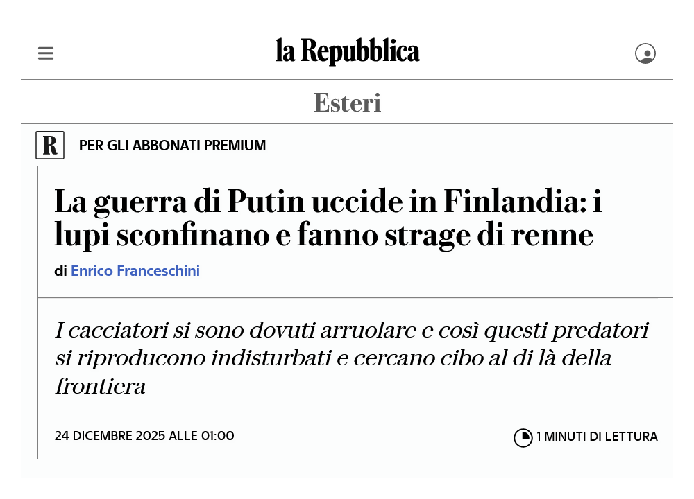 2 Ora. Sì, mi chiedo ancora come sia possibile, dopo quasi 4 anni, che milioni di soggetti apparentemente senzienti si facciano ancora trattare come imbecilli dal sistema italiano e unionista. Anzi, lo applaudono. Di storie anti-russe ne vogliono ancora di più. C'è qualcosa di storto in loro, qualcosa che attiene ad un amor proprio di cui, evidentemente, deficitano a livelli preoccupanti. Preferendo l'Odio irrazionale e auto-lesionistico all'approfondimento consapevole degli argomenti. La cosiddetta “psichiatrizzazione della parte avversa” – detta “psichiatrizzazione del dissenso” quando è agita dallo Stato – è una pratica deplorevole, tuttavia credo che quel segmento della popolazione che secondo i sondaggi è sempre più risicato andrebbe davvero analizzato sui lettini di “quelli bravi”, al fine di limitare i danni per loro e per i senzienti. E ... auguri di Buon Natale e Buone Feste a tutti i soggetti senzienti, che gli altri nemmeno sanno. = Note [1] : ''La guerra di Putin uccide in Finlandia: i lupi sconfinano e fanno strage di renne'', Enrico Franceschini, la Repubblica, 24 dicembre 2025, [ https://www.repubblica.it/esteri/2025/12/24/news/guerra_ucraina_russia_renne_finlandia_morte_lupi_confine-425058162/ ]. [2] : trad. da ''‘Santa’s reindeer’ are under threat. Are Russia’s wolves to blame?'', Isobel Yeung e Mick Krever, CNN, 22 dicembre 2025, [ https://edition.cnn.com/2025/12/22/europe/finland-reindeer-russia-wolves ]. === --- { prima pubblicazione del post su VK, il 25 dicembre 2025 [3]; su FB : [4] }. |