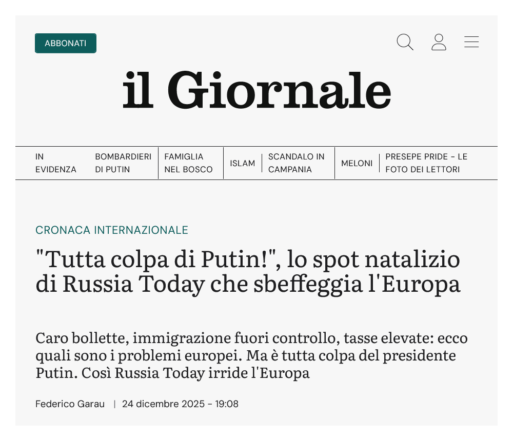 1.1 Lo spot è stato pubblicato due giorni fa sul sito [4], è cantato in lingua inglese ed è abbastanza intuitivo, ma è possibile guardarlo sottotitolato in lingua italiana in molte pagine-web { [5]... }. = Note [1] : RT, sito-web, [ https://www.rt.com/ ]; X : [ https://x.com/rt_com ]. [2] : ''Notizie'', Marco Poli, VK, 1° marzo 2022, [ https://vk.com/wall170191717_2023 ]; FB : [ https://www.facebook.com/Bufalo/posts/10226497090830045 ]; ODB : [ https://orlodelboccale.blogspot.com/2022/03/censura-democratica-e-liberale-nella-ue.html ]. [3] : ''"Tutta colpa di Putin!", lo spot natalizio di Russia Today che sbeffeggia l'Europa'', Federico Garau, il Giornale, 24 dicembre 2025, [ https://www.ilgiornale.it/news/cronaca-internazionale/tutta-colpa-putin-spot-natalizio-russia-today-che-sbeffeggia-2587821.html ]. [4] : ''‘It’s all because of Putin’: RT drops Christmas song spoof (AI VIDEO)'', RT, 23 dicembre 2025, [ https://www.rt.com/news/629932-rt-christmas-europe-putin/ ]; { MP4 } : [ https://mf.b37mrtl.ru/files/2025.12/694ab6232030274b1438d5b3.mp4?download=1 ]; vedi : post, Margarita Simonyan, X, 23 dicembre 2025, [ https://x.com/M_Simonyan/status/2003414075418857504 ]. [5] : post, Matteo Gracis, X, 24 dicembre 2025, [ https://x.com/matteogracis/status/2003773175893827755]. === --- { prima pubblicazione del post su VK, il 25 dicembre 2025 [6]; su FB : [7] }. |