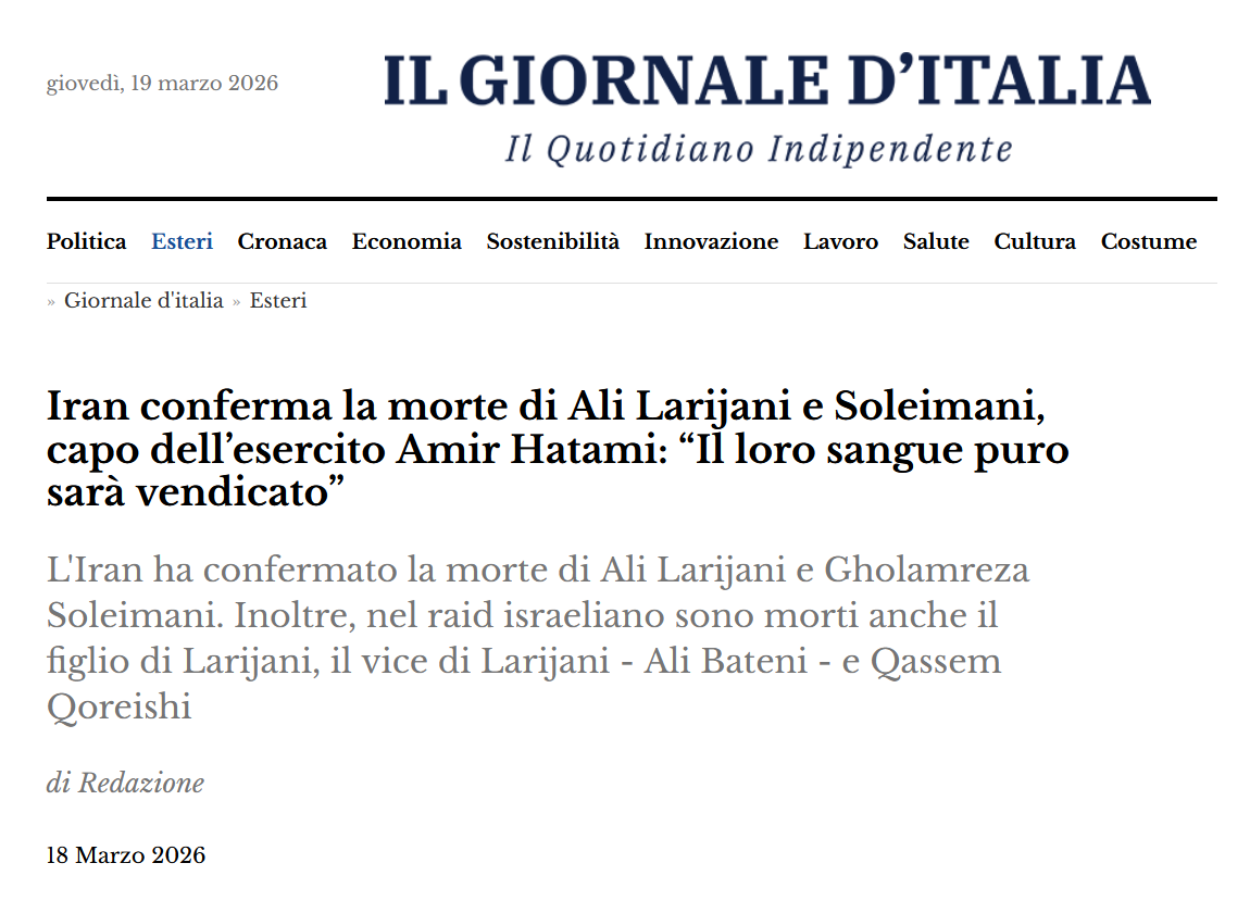 [3] : ''Iran conferma la morte di Ali Larijani e Soleimani, capo dell’esercito Amir Hatami: “Il loro sangue puro sarà vendicato”'', Il Giornale d'Italia, 18 marzo 2026, [ https://www.ilgiornaleditalia.it/news/esteri/775749/iran-conferma-la-morte-di-ali-larijani-e-soleimani-capo-dellesercito-amir-hatami-il-loro-sangue-puro-sara-vendicato.html ];