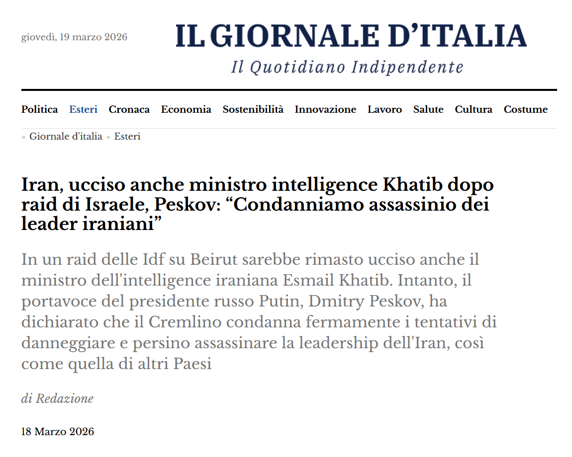 [4] : ''Iran, ucciso anche ministro intelligence Khatib dopo raid di Israele, Peskov: “Condanniamo assassinio dei leader iraniani”'', Il Giornale d'Italia, 18 marzo 2026, [ https://www.ilgiornaleditalia.it/news/esteri/775786/iran-ucciso-anche-ministro-intelligence-khatib-dopo-raid-di-israele-peskov-condanniamo-assassinio-dei-leader-iraniani.html ];