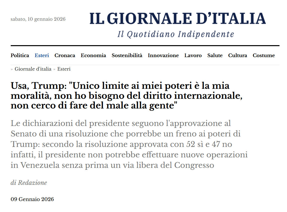 Spettacolo assoluto. Come fare schiattare i popolani che nei mesi scorsi hanno stracciato interi guardaroba di vestiti e, negli States, protestato nelle strade con le manifestazioni ''No Kings'' { [12]...[13][14]... }. Lo staff trumpiano è maestro nell'uso dei social media e specialmente delle argomentazioni e delle fazioni degli utenti, credo che verrà studiato nei testi futuri sulla comunicazione di massa. ♥ = Note [1] : ''Notizie'', Marco Poli, VK, 3 gennaio 2026, [ https://vk.com/wall170191717_4853 ]; FB : [ https://www.facebook.com/Bufalo/posts/pfbid02DJBN82yKvgEevEJ32dfDntEoiRxMqKtMVmCwBS6xASC3YTgJ2vLG2HeuTZ1MXNyUl ]; ODB : [ https://orlodelboccale.blogspot.com/2026/01/lo-stato-venezuelano-ha-consegnato.html ]. [2] : ''Archivio, e Glossario'', Marco Poli, VK, 7 gennaio 2026, [ https://vk.com/wall170191717_4859 ]; FB : [ https://www.facebook.com/Bufalo/posts/pfbid02uwvG6qnMY4rw2cTYe4nNRtWSoAYeQHBuKK4s1wzyo2yCb8vKVFasjDJTvJMus9oYl ]; ODB : [ https://orlodelboccale.blogspot.com/2026/01/dottrina-donroe.html ]. [3] : ''Notizie, e Archivio'', Marco Poli, VK, 7 gennaio 2026, [ https://vk.com/wall170191717_4862 ]; FB : [ https://www.facebook.com/Bufalo/posts/pfbid0Qzhu15WxCDPuTfbroaMNkLdWwe824vsVTmVQzA4ovyvvGb3NvpyRd66aswYxH1g3l ]; ODB : [ https://orlodelboccale.blogspot.com/2026/01/chi-sara-il-prossimo.html ]. [4] : ''Withdrawing the United States from International Organizations, Conventions, and Treaties that Are Contrary to the Interests of the United States'', The White House, 7 gennaio 2026, [ https://www.whitehouse.gov/presidential-actions/2026/01/withdrawing-the-united-states-from-international-organizations-conventions-and-treaties-that-are-contrary-to-the-interests-of-the-united-states/ ]; vedi : ''Fact Sheet: President Donald J. Trump Withdraws the United States from International Organizations that Are Contrary to the Interests of the United States'', U.S. Mission to the UN Agencies in Rome, 8 gennaio 2026, [ https://usunrome.usmission.gov/fact-sheet-president-donald-j-trump-withdraws-the-united-states-from-international-organizations-that-are-contrary-to-the-interests-of-the-u-s/ ]. [5] : ''Trump sferra un attacco decisivo al clima e alla cooperazione chiudendo la porta a 66 organizzazioni internazionali in un colpo solo'', Tommaso Perrone, Wired ITA, 8 gennaio 2026, [ https://www.wired.it/article/trump-attacco-clima-cooperazione-fuori-66-organizzazioni-internazionali/ ]. [6] : ''Trump ritira gli Stati Uniti da 66 organizzazioni internazionali tra cui trattato Onu sul clima, Ue attacca: “Decisione deplorevole"'', Il Giornale d'Italia, 8 gennaio 2026, [ https://www.ilgiornaleditalia.it/news/esteri/761441/trump-ritira-gli-stati-uniti-da-66-organizzazioni-internazionali-tra-cui-trattato-onu-sul-clima-ue-attacca-decisione-deplorevole.html ]. [7] : ''Trump calls for $1.5 trillion military budget in 2027, up from $901 bln in 2026'', Costas Pitas e Andrea Shalal, Reuters, 8 gennaio 2026, [ https://www.reuters.com/world/us/trump-says-us-military-budget-2027-should-be-15-trillion-2026-01-07/ ]; vedi : ''One Trillion Dollars NON è un trilione di $!'', Licia, Terminologia etc., 25 novembre 2023, [ https://www.terminologiaetc.it/2023/11/25/falsi-amici-trillion-trilione/ ]; vedi : post, Donald J. Trump, Truth, 7 gennaio 2026, [ https://truthsocial.com/@realDonaldTrump/posts/115855894695940909 ]. [8] : ''Chekhov's gun'', AA. VV., Wikipedia ENG, [ https://en.wikipedia.org/w/index.php?title=Chekhov%27s_gun&oldid=1322068352 ]; vedi : ''La pistola di Čechov: come usare questo principio di scrittura'', Nadia Corvino, ilLibraio[punto]it, 3 novembre 2022, [ https://www.illibraio.it/news/scrittura/la-pistola-di-cechov-principio-di-scrittura-1428850/ ]. [9] : ''US Senate advances measure curbing Trump's Venezuela war powers'', Patricia Zengerle, Reuters, 9 gennaio 2026, [ https://www.reuters.com/world/americas/us-senate-vote-reining-trump-venezuela-2026-01-08/ ]; vedi : ''Roll Call Vote 119th Congress - 2nd Session'', U. S. Senate, 8 gennaio 2026, [ https://www.senate.gov/legislative/LIS/roll_call_votes/vote1192/vote_119_2_00005.htm ]. [10] : vedi ''Presidential Veto/De Facto Supermajority Requirement'', in ''The Congressional Review Act (CRA): Frequently Asked Questions'', Library of Congress, Congress[punto]gov, [ https://www.congress.gov/crs-product/R43992 ]; vedi anche : ''Supermajority'', AA. VV., Wikipedia ENG, [ https://en.wikipedia.org/w/index.php?title=Supermajority&oldid=1331829543 ]. [11] : trad. da ''Trump Lays Out a Vision of Power Restrained Only by ‘My Own Morality’'', AA. VV., The New York Times, 8 gennaio 2026, [ https://www.nytimes.com/2026/01/08/us/politics/trump-interview-power-morality.html ]; vedi : ''Usa, Trump: "Unico limite ai miei poteri è la mia moralità, non ho bisogno del diritto internazionale, non cerco di fare del male alla gente"'', Il Giornale d'Italia, 9 gennaio 2026, [ https://www.ilgiornaleditalia.it/news/esteri/761736/usa-trump-unico-limite-ai-miei-poteri-e-la-mia-moralita-non-ho-bisogno-del-diritto-internazionale-non-cerco-di-fare-del-male-alla-gente.html ]. [12] : ''No Kings'', sito-web, [ https://www.nokings.org/ ]. [13] : ''June 2025 No Kings protests'', AA. VV., Wikipedia ENG, [ https://en.wikipedia.org/w/index.php?title=June_2025_No_Kings_protests&oldid=1332354921 ]. [14] : ''October 2025 No Kings protests'', AA. VV., Wikipedia ENG, [ https://en.wikipedia.org/w/index.php?title=October_2025_No_Kings_protests&oldid=1332354939 ]; vedi : ''King Trump? In piazza l’America che dice “no”'', Alessia De Luca, ISPI, 20 ottobre 2025, [ https://www.ispionline.it/it/pubblicazione/king-trump-in-piazza-lamerica-che-dice-no-220896 ]. === --- { prima pubblicazione del post su VK, l'11 gennaio 2026 [15]; su FB : [16] }. |