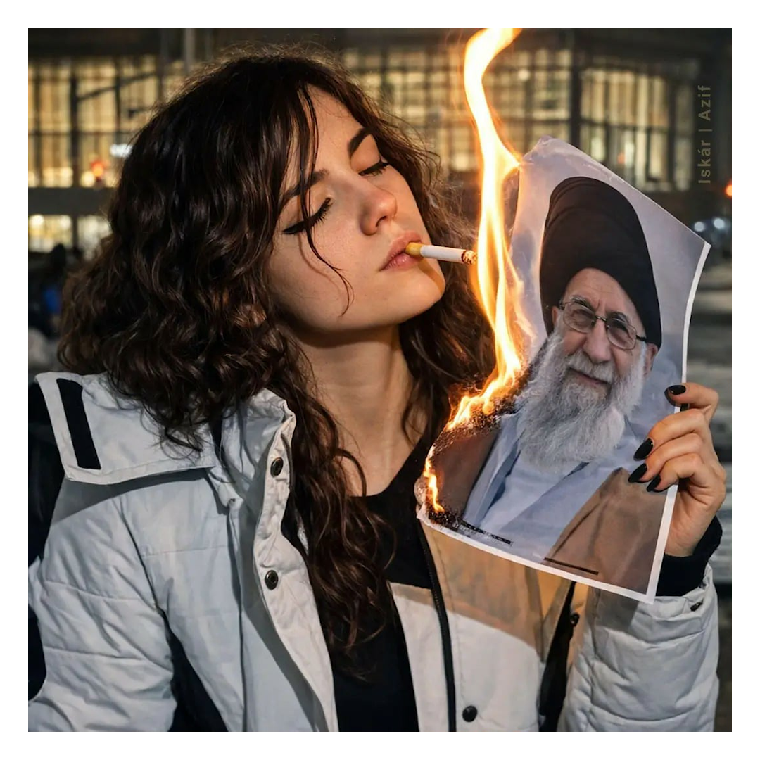Notizie, e Foto di Marco Poli Sono nemmeno trascorse due settimane dall'inizio dell'anno, che una grande quantità di eventi si è affastellata sullo schermo informativo. E abbiamo già una delle immagini iconiche del 2026. 1 Alla fine del 2025, nella Persia ancora amministrata dalla teocratica Repubblica Islamica dell'Iran è scoppiata l'ennesima catena di manifestazioni contro il regime dei sottanoni barbaciabatte. Ricordo che nel 2022 la rivolta era partita dalla morte in caserma della 22enne curda Mahsa Amini, ''arrestata dalla polizia morale perché indossava male il velo'', ed era stata caratterizzata dalla rivendicazione dei pieni diritti civili per le donne iraniane [1]. Venne spenta dalla violenta reazione del regime, con morti ammazzati e migliaia di cittadini incarcerati. Stavolta, la scintilla è stata il forte rincaro dei prezzi a causa di ''anni di cattiva gestione governativa, una corruzione endemica e il perdurare delle sanzioni internazionali'', che ha messo in difficoltà parecchie famiglie, e all'agitazione dei commercianti si sono successivamente aggregati altri gruppi sociali che lottano per la caduta del regime [2]. E' arrivata la brutale repressione agita dal regime, con il black-out di internet in tutto il Paese [3]. La stima di parte occidentale dice 12k cittadini ammazzati, molti dei quali giovani, ma fossero anche 1/10 sarebbe un numero impressionante di esecuzioni in circa due settimane di proteste e rivolte. Nel frattempo, Donald Trump incita i manifestanti a tenere duro, nell'attesa di un'azione statunitense fors'anche militare. Proteste da parte del Cremlino che, tuttavia, sappiamo bene che al 99% non saranno seguite da fatti congruenti stante l'impegno militare ed economico russo in Ucraina e in altre zone del globo [4]. Ovviamente, nessuna parola di Francesca Albanese sul massacro di manifestanti in Persia [5]. Mostrando poco equilibrio, l'area dissenziente italiana considera le manifestazioni come una mera costruzione dei servizi occidentali per tentare il regime change e imporre il figlio dello Scià di Persia, Reza Ciro Pahlavi, alla guida del Paese. L'opzione è attualmente viva [6], ma considerare nullo il disagio del popolo persiano – come già quello del popolo venezuelano, e altri – è la manifestazione di un fanatismo ideologico ruffiano, ipocrita, e sostanzialmente distruttivo. 2 Pochi giorni fa, sono circolati una foto ( forse un fermo-immagine ) e un video che ritraggono una bella mora dai tratti persiani che dà fuoco alla foto del sottanone capo e con essa si accende una sigaretta, imitando un'altra ragazza che aveva ritratto lo stesso gesto [7][8]. Si tratterebbe di una esule che vive a Toronto ( Canada ) e si definisce ''femminista radicale'' [9], ed ha così voluto esprimere il suo supporto ai coetanei che in questi giorni hanno riempito le strade persiane. Immagine – che allego – e video hanno avuto immediatamente una diffusione virale, e, ovviamente, sono stati trattati dai soliti auto-odiatori come fake [10]. Altre ragazze stanno emulando la mora { [11][12][13][14]... }. = Note [1] : ''Iran: la rivoluzione è donna'', ISPI, 27 settembre 2022, [ https://www.ispionline.it/it/pubblicazione/iran-la-rivoluzione-e-donna-36274 ]. [2] : ''Iran: la protesta del carovita infiamma lo scontro con Washington'', Alessia De Luca, ISPI, 2 gennaio 2026, [ https://www.ispionline.it/it/pubblicazione/iran-la-protesta-del-carovita-infiamma-lo-scontro-con-washington-226837 ]. [3] : ''Proteste in Iran: tra repressione e rischio escalation'', Alessia De Luca, ISPI, 12 gennaio 2026, [ https://www.ispionline.it/it/pubblicazione/proteste-in-iran-tra-repressione-e-rischio-escalation-227412 ]. [4] : ''Sangue in Iran: 12mila persone uccise durante le proteste. Trump ai manifestanti: "Continuate, l'aiuto è in arrivo". E Netanyahu convoca ministri e consiglieri'', il Giornale, 13 gennaio 2026, [ https://www.ilgiornale.it/news/politica-estera/trump-ai-cittadini-usa-lasciate-liran-2594507.html ]. [5] : ''Il silenzio di Francesca Albanese sulla repressione in Iran'', Filippo Jacopo Carpani, il Giornale, 13 gennaio 2026, [ https://www.ilgiornale.it/news/interni/silenzio-francesca-albanese-sulla-repressione-iran-2594678.html ]. [6] : ''Reza Pahlavi chiama lo sciopero generale: “Prepariamoci a difendere i centri cittadini”'', Francesca Salvatore, il Giornale, 10 gennaio 2026, [ https://www.ilgiornale.it/news/cronaca-internazionale/appello-sciopero-generale-iran-reza-pahlavi-prepariamoci-2593350.html ]; vedi : ''Chi è Reza Ciro Pahlavi, l'erede dello Scià d’Iran che fu costretto a lasciare il suo Paese nel 1979 dopo la rivoluzione islamica'', Andrea Cianferoni, Il Giornale d'Italia, 11 gennaio 2026, [ https://www.ilgiornaleditalia.it/news/costume/761926/chi-e-reza-ciro-pahlavi-l-erede-dello-scia-diran-che-fu-costretto-a-lasciare-il-suo-paese-nel-1979-dopo-la-rivoluzione-islamica.html ]. [7] : post, Morticia Addams, X, 8 gennaio 2026, [ https://x.com/melianouss/status/2009161771110862931 ]. [8] : ''Sigarette accese con foto in fiamme di Khamenei, la protesta delle iraniane'', Rai News, 11 gennaio 2026, [ https://www.rainews.it/video/2026/01/sigarette-accese-con-foto-in-fiamme-di-khamenei-la-protesta-delle-iraniane-7fb161c5-5ab8-4ed2-99ce-d17ed3e1e2fa.html ]; vedi : Morticia Addams, X, 9 gennaio 2026, [ https://x.com/melianouss/status/2009614783134449688?s=20 ]. [9] : Morticia Addams, X, [ https://x.com/melianouss ]. [10] : ''Le bufale sulla foto della ragazza con la sigaretta contro Khamenei'', David Puente, Open, 11 gennaio 2026, [ https://www.open.online/2026/01/11/bufale-foto-simbolo-proteste-iraniane-khamenei-accuse-infondate-ragazza-fc/ ]. [11] : post, Progresismo Out Of Context, X, 9 gennaio 2026, [ https://x.com/OOCprogresismo2/status/2009468546624188906 ]. [12] : post, Progresismo Out Of Context, X, 10 gennaio 2026, [ https://x.com/visegrad24/status/2009930564422582783 ]. [13] : post, X, 10 gennaio 2026, [ https://x.com/frggiiiee/status/2010004465345