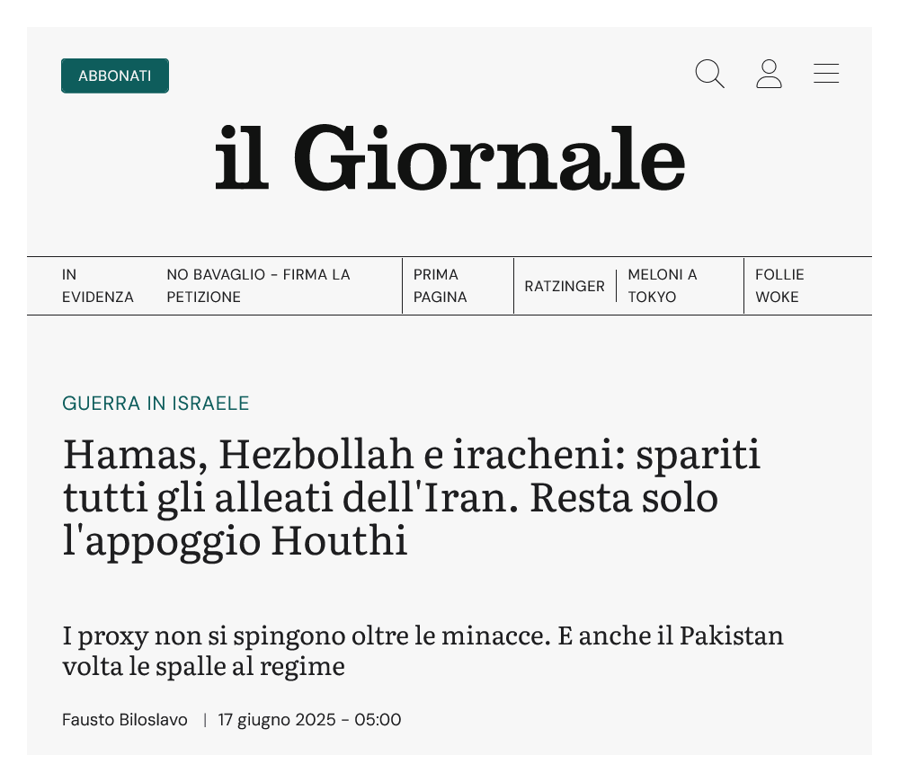 Archivio, e Notizie di Marco Poli Giusto ieri, ascoltavo un vecchietto un po' fanatico affermare che il cosiddetto “asse della resistenza” { [1]...[2][3]... } – un'accolita di organizzazioni politiche e gruppi armati che hanno come pilastro la dirigenza iraniana, e che, a seconda del punto di vista, possono essere definiti ''resistenti'' oppure ''terroristi'' – sarebbe ''ancora tutto lì''. Insomma, sarebbe ''integro''. Ecco ... per Carità, il fanatismo e magari altro possono indurre allucinazioni, e di conseguenza far perdere il focus sulla Realtà Concreta. 1 Hamas è stata brutalmente ridotta ai minimi termini, Hezbollah è stata decapitata e devastata, il Pakistan ha fatto sapere a suo tempo che non interverrà in caso di aggressione all'Iran, lo Stato siriano di Assad è crollato in 24 ore e spazzato via dalle canaglie dell'ISIS [4], e i ciabattari houthi hanno sospeso le ostilità e potrebbero indirizzare la loro prossima attività nel Somaliland ( l'ex-Somalia britannica ) ch'è stato riconosciuto da Israele { ...[5]...[6][7]... }. 2 Lo Stato teocratico fa parte dei BRICS e dello SCO ( l'Organizzazione di Shangai ) e, in particolare, i rapporti con la Federazione Russa e la Repubblica Popolare Cinese sono stati e sono significativi per Teheran. Tuttavia, le dirigenze di Mosca e Pechino sono state caute sia durante la Guerra dei 12 giorni { [8][9]... } che durante le manifestazioni correnti { [10][11]... }, cioè hanno dichiarato generico disappunto ma non sono intervenute con le armi, né hanno fatto ricorso alla deterrenza atomica che posseggono. = Note [1] : ''Axis of Resistance'', AA. VV., Wikipedia ENG, [ https://en.wikipedia.org/w/index.php?title=Axis_of_Resistance&oldid=1331888817 ]; vedi : ''Funding of the Axis of Resistance'', AA. VV., Wikipedia ENG, [ https://en.wikipedia.org/w/index.php?title=Funding_of_the_Axis_of_Resistance&oldid=1331891576 ]. [2] : ''Il soft power iraniano e la sua rete di milizie'', Lorenzo Forlani, Orient XXI, 2 settembre 2024, [ https://orientxxi.info/il-soft-power-iraniano-e-la-sua-rete-di-milizie,7570 ]. [3] : ''L’Iran e l’asse della resistenza: alleanza a geometria variabile'', Valeria Talbot e Luigi Toninelli, ISPI, ottobre 2024, { PDF }, [ https://www.parlamento.it/application/xmanager/projects/parlamento/file/repository/affariinternazionali/osservatorio/approfondimenti/PI0218.pdf ]. [4] : ''Hamas, Hezbollah e iracheni: spariti tutti gli alleati dell'Iran. Resta solo l'appoggio Houthi'', Fausto Biloslavo, il Giornale, 17 giugno 2025, [ https://www.ilgiornale.it/news/politica/hamas-hezbollah-e-iracheni-spariti-tutti-alleati-delliran-2495986.html ]. [5] : ''Gli Houthi, le armi e i finanziamenti provenienti dall’Iran'', Laura Silvia Battaglia, RSI, 2 ottobre 2024, [ https://www.rsi.ch/info/mondo/Gli-Houthi-le-armi-e-i-finanziamenti-provenienti-dall%E2%80%99Iran--2265738.html ]. [6] : ''Riflessi della tregua a Gaza: gli Houthi annunciano uno stop alle ostilità'', Ilario Piagnerelli, Rai News, 11 novembre 2025, [ https://www.rainews.it/video/2025/11/riflessi-della-tregua-a-gaza-gli-houthi-annunciano-uno-stop-alle-ostilita-aed1c755-3647-45bf-a72d-859d3aac23f0.html ]. [7] : ''Deportazioni e raid anti-Houthi, Israele riconosce il Somaliland'', Chiara Cruciati, il Manifesto, 27 dicembre 2025, [ https://ilmanifesto.it/deportazioni-e-raid-anti-houthi-israele-riconosce-il-somaliland ]. [8] : ''Cina e Iran, “alleanza” a metà'', Lisa Guerra, Atlante, Treccani, 30 giugno 2025, [ https://www.treccani.it/magazine/atlante/geopolitica/cina-e-iran-alleanza-a-meta.html ]. [9] : ''Cina-Iran, cosa c’è dietro la freddezza di Pechino. Report ChinaMed'', Veronica Turrini, Formiche[punto]net, 22 novembre 2025, [ https://formiche.net/2025/11/cina-iran-cosa-ce-dietro-alla-freddezza-di-pechino-report-chinamed/ ]. [10] : ''Iran sotto pressione tra proteste e crisi economica: la Cina frena il sostegno a Teheran'', Stefano Piazza, Panorama, 13 gennaio 2026, [ https://www.panorama.it/attualita/esteri/iran-sotto-pressione-tra-proteste-e-crisi-economica-la-cina-frena-il-sostegno-a-teheran ]. [11] : ''Il silenzio del Cremlino sulle proteste in Iran nasconde quanto la Russia abbia da perdere'', Umberto De Giovannangeli, Globalist Syndacation, 15 gennaio 2026, [ https://www.globalist.it/world/2026/01/15/il-silenzio-del-cremlino-sulle-proteste-in-iran-nasconde-quanto-la-russia-abbia-da-perdere/ ]. === --- { prima pubblicazione del post su VK, il 17 gennaio 2026 [12]; su FB : [13] }. |