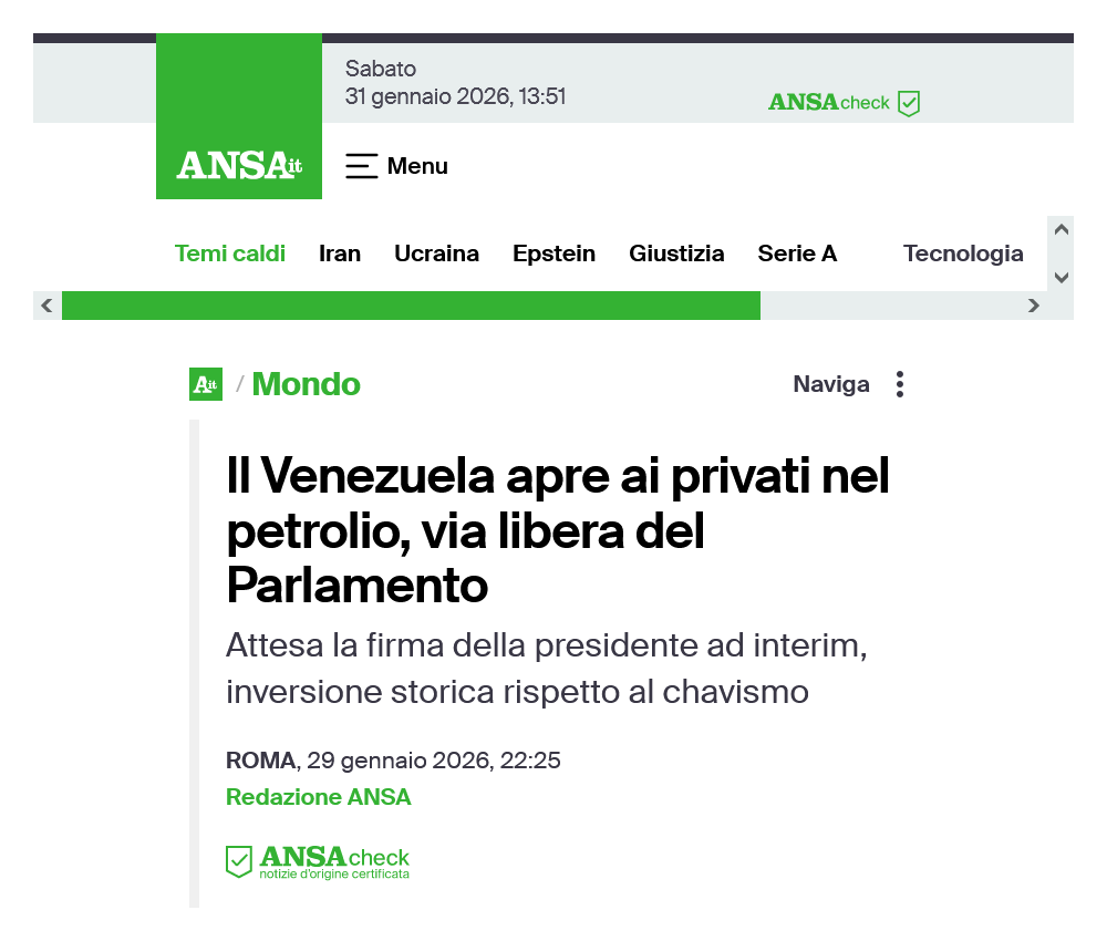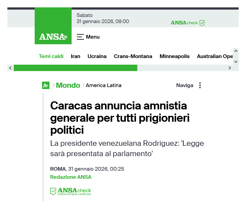 Sottolineo : all'unanimità. 4 Ovviamente, i leader bolivaristi venezuelani stanno girando la frittata come una “grande vittoria” del loro partito e dell'industria petrolifera nazionale ( la PDVSA ), ma sono chiacchiere ad uso dei brevilinei fanatici rossi interni ed esteri. Stanno facendo la cosa giusta, anche se ai puritani nostrani della narrazione bolivarista = comunista cioè agli agonisti della nota ( e, purtroppo, mai accantonata ) disciplina del “Fare i froci con il culo degli altri” non piace affatto, siccome gli sta venendo a mancare un “eroico baluardo” contro il kativo Trump e l'imperialismo americano. Coraggio. Gli rimangono Cuba e l'Iran. ... Per poco. ☺ = Note [1] : ''Notizie'', Marco Poli, VK, 3 gennaio 2026, [ https://vk.com/wall170191717_4853 ]; FB : [ https://www.facebook.com/Bufalo/posts/pfbid02DJBN82yKvgEevEJ32dfDntEoiRxMqKtMVmCwBS6xASC3YTgJ2vLG2HeuTZ1MXNyUl ]; ODB : [ https://orlodelboccale.blogspot.com/2026/01/lo-stato-venezuelano-ha-consegnato.html ]. [2] : ''Venezuela: liberati Trentini e Burlò, l'annuncio del ministro Tajani - 1Mattina News 12/01/2026'', RAI, YouTube, 12 gennaio 2026, [ https://www.youtube.com/watch?v=TFdI1mcqJPo ]. [3] : ''Venezuela, in carcere 42 detenuti italiani con doppio passaporto: chi sono e cosa sappiamo'', Sky TG24, 13 gennaio 2026, [ https://tg24.sky.it/mondo/2026/01/13/venezuela-detenuti-italiani-cosa-sappiamo ]. [4] : ''Caracas annuncia amnistia generale per tutti prigionieri politici'', ANSA, 31 gennaio 2026, [ https://www.ansa.it/sito/notizie/mondo/americalatina/2026/01/31/caracas-annuncia-amnistia-generale-per-tutti-prigionieri-politici_0640b49e-0647-4725-a5b9-b12db58eec2c.html ]. [5] : ''Venezuela, El Helicoide sarà chiuso e trasformato in uno spazio sociale'', ANSA, 31 gennaio 2026, [ https://www.ansa.it/sito/notizie/topnews/2026/01/31/venezuela-el-helicoide-sara-chiuso-e-trasformato-in-uno-spazio-sociale_a8d0d1bc-152c-4b36-be2b-c4f9f7c2f1f0.html ]. [6] : ''Lágrimas de alegría y abrazos entre los familiares de los presos: “Todos van a salir, toda esta lucha se va a acabar”'', Florantonia Singer, El País, 31 gennaio 2026, [ https://elpais.com/america/2026-01-31/lagrimas-de-alegria-y-abrazos-entre-los-familiares-de-los-presos-todos-van-a-salir-toda-esta-lucha-se-va-a-acabar.html ]. [7] : ''A quién beneficiará la amnistía anunciada por Delcy Rodríguez en Venezuela'', El País, [ https://elpais.com/expres/2026-01-31/que-significa-la-amnistia-anunciada-por-delcy-rodriguez-en-venezuela-y-a-quien-beneficiaria.html ]. [8] : ''John Ratcliffe'', AA. VV., Wikipedia ENG, [ https://en.wikipedia.org/w/index.php?title=John_Ratcliffe&oldid=1333389813 ]. [9] : ''Delcy Rodríguez'', AA. VV., Wikipedia ENG, [ https://en.wikipedia.org/w/index.php?title=Delcy_Rodríguez&oldid=1335765721 ]. [10] : ''CIA Director Traveled to Caracas to Meet Venezuela’s Delcy Rodríguez'', AA. VV., The Wall Street Journal, 16 gennaio 2026, [ https://www.wsj.com/world/americas/cia-director-traveled-to-caracas-to-meet-venezuelas-delcy-rodriguez-0f79dc59 ]. [11] : trad. da ''Delcy Rodríguez Goes From Pariah to the U.S. Pick to Lead Venezuela'', Ian Lovett e Kejal Vyas, The Wall Street Journal, 16 gennaio 2026, [ https://www.wsj.com/world/americas/venezuela-delcy-rodriguez-trump-leader-pick-86770dd0 ]. [12] : ''In Venezuela, Freeing the Economy, but Nothing Else'', Anatoly Kurmanaev, The New York Times, 26 gennaio 2026, [ https://www.nytimes.com/2026/01/26/world/americas/venezuela-economy-rodriguez.html ]. [13] : ''Can Venezuela’s Delcy Rodríguez become a Latin American Deng Xiaoping?'', Tom Phillips, The Guardian, 28 gennaio 2026, [ https://www.theguardian.com/world/2026/jan/28/can-venezuelas-delcy-rodriguez-become-a-latin-american-deng-xiaoping ]. [14] : trad. da ''Venezuela’s Delcy Rodríguez assured US of cooperation before Maduro’s capture'', Aram Roston, The Guardian, 22 gennaio 2026, [ https://www.theguardian.com/world/2026/jan/22/delcy-rodriguez-capture-maduro-venezuela ]. [15] : trad. da ''Leaked video shows Venezuela regime’s desperate struggle to control message'', Tiago Rogero, The Guardian, 23 gennaio 2026, [ https://www.theguardian.com/world/2026/jan/23/venezuela-leaked-video-delcy-rodriguez-maduro ]. [16] : fonte #11. [17] : trad. da ''Venezuela da luz verde a la entrada de capital extranjero para explotar el petróleo'', Florantonia Singer, El País, 30 gennaio 2026, [ https://elpais.com/america/2026-01-30/el-regimen-de-venezuela-da-luz-verde-a-la-entrada-de-capital-extranjero-para-explotar-el-petroleo.html ]; vedi anche : ''Il Venezuela apre ai privati nel petrolio, via libera del Parlamento'', ANSA, 29 gennaio 2026, [ https://www.ansa.it/sito/notizie/mondo/2026/01/29/il-venezuela-apre-ai-privati-nel-petrolio-via-libera-del-parlamento_82e11e6e-0f79-440b-9ab7-4e8240d47606.html ]. === --- { prima pubblicazione del post su VK, il 31 gennaio 2026 [18]; su FB : [19] }. |