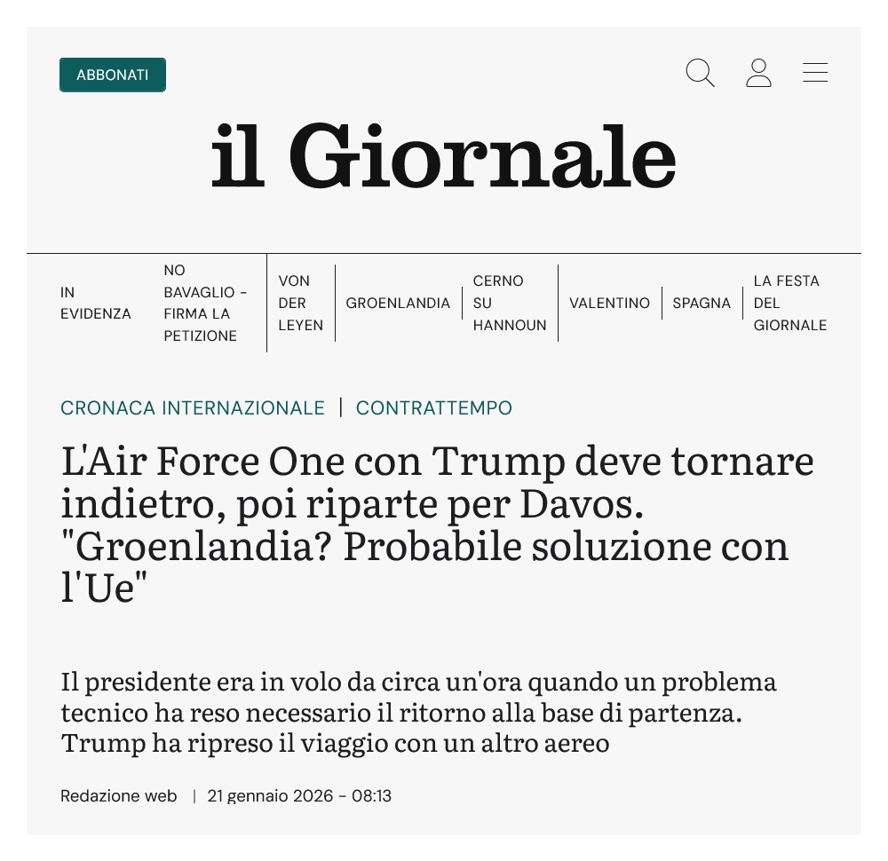 [1] : ''L'Air Force One con Trump deve tornare indietro, poi riparte per Davos. "Groenlandia? Probabile soluzione con l'Ue"'', il Giornale, 21 gennaio 2026, [ https://www.ilgiornale.it/news/cronaca-internazionale/lair-force-one-trump-bordo-deve-tornare-indietro-cosa-2598365.html ].