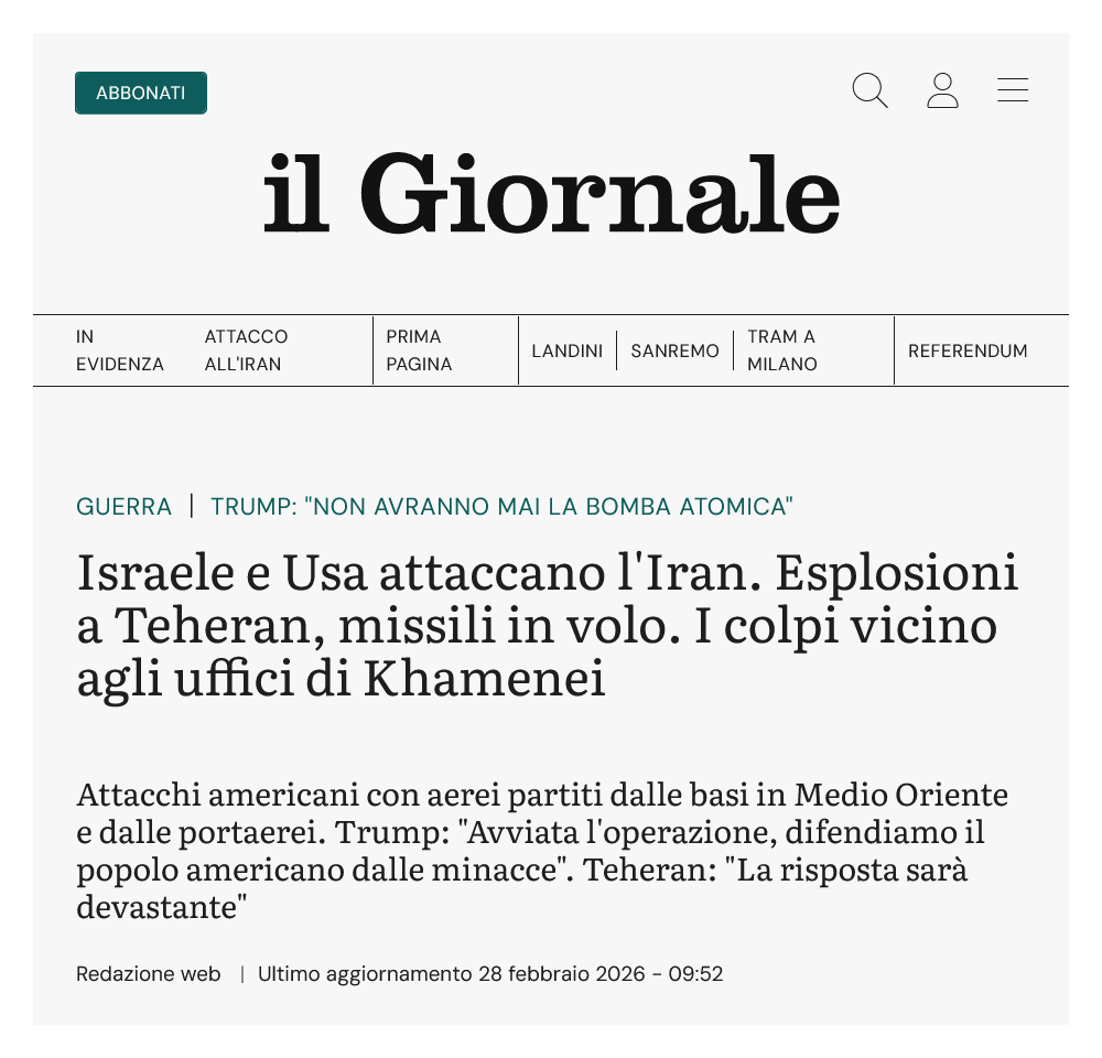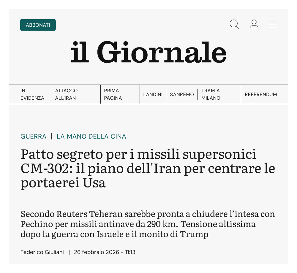E' chiaro che potrebbe essere stata “pre-tattica” finalizzata a creare un frame utile a giustificare un repentino intervento, tuttavia i rapporti commerciali e politici tra Teheran e alcuni Paesi BRICS sono noti, pertanto la notizia ha un fondamento di Realtà Concreta. 2 Abbiamo visto l'apertura. Ci sono due variabili nel gioco che dovrebbero essere presto scoperte, e sono le reazioni di Federazione Russa ed RPC, che in queste settimane stanno conducendo un'esercitazione navale congiunta con Teheran nel Golfo Persico { [5][6][7]... }. Le reazioni consteranno del solito rammarico retorico ? Ci saranno manovre militari dissuasive la continuazione dell'azione israelo-statunitense ? E quali ? Detto in modo più chiaro : possono esistere manovre dissuasive efficaci senza scatenare un vero-e-proprio terzo conflitto mondiale ? Dubito. ... Vedremo. ... Vado a preparare i wurstel. Giusto ieri, li ho comprati al mio supermercato di fiducia. ... = Note [1] : ''Archivio, e Notizie'', Marco Poli, VK, 8 febbraio 2026, [ https://vk.com/wall170191717_4921 ]; ODB : [ https://orlodelboccale.blogspot.com/2026/02/la-abramo-lincoln-e-operativa-nel-golfo.html ]. [2] : ''Israele e Usa attaccano l'Iran. Esplosioni a Teheran, missili in volo. I colpi vicino agli uffici di Khamenei'', il Giornale, 28 febbraio 2026, [ https://www.ilgiornale.it/news/guerra/israele-ha-lanciato-attacco-preventivo-alliran-2628935.html ]. [3] : ''Attacchi ad Israele e a basi Usa: ecco come potrebbe reagire Teheran'', Valerio Chiapparino, il Giornale, 28 febbraio 2026, [ https://www.ilgiornale.it/news/guerra/attacchi-ad-israele-e-basi-usa-ecco-potrebbe-reagire-teheran-2629144.html ]. [4] : ''Patto segreto per i missili supersonici CM-302: il piano dell'Iran per centrare le portaerei Usa'', Federico Giuliani, il Giornale, 26 febbraio 2026, [ https://www.ilgiornale.it/news/guerra/patto-segreto-i-missili-supersonici-cm-302-piano-delliran-2626606.html ]. [5] : ''Russia, China, Iran Launch “Maritime Security Belt 2026” Naval Drills in Strait of Hormuz as US Deploys Dual Carrier Strike Groups'', Defence Security Asia, 17 febbraio 2026, [ https://defencesecurityasia.com/en/russia-china-iran-maritime-security-belt-2026-strait-of-hormuz-us-carrier-strike-group/ ]. [6] : ''Iran and Russia to Hold Joint Navy Drills as U.S. Pressures Tehran on Nuclear Program'', The Moscow Times, 18 febbraio 2026, [ https://www.themoscowtimes.com/2026/02/18/iran-and-russia-to-hold-joint-navy-drills-as-us-pressures-tehran-on-nuclear-program-a91990 ]. [7] : ''Esercitazioni militari nello Stretto di Hormuz: cosa c'è dietro la mossa di Iran, Cina e Russia'', Federico Giuliani, il Giornale, 19 febbraio 2026, [ https://www.ilgiornale.it/news/cronaca-internazionale/esercitazioni-militari-nello-stretto-hormuz-cosa-c-dietro-2612247.html ]. === --- { prima pubblicazione del post su VK, il 28 febbraio 2026 [8] }. |