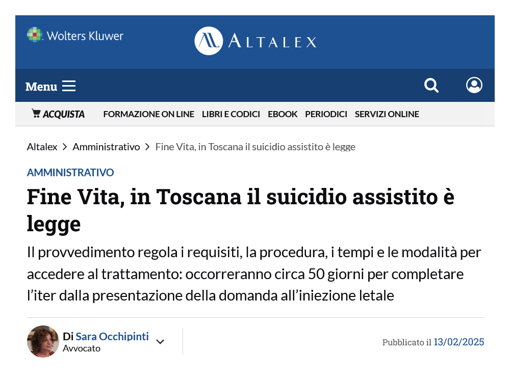 4.1 Azioni : ● Legge regionale n. 16 del 14 marzo 2025, ''Modalità organizzative per l’attuazione delle sentenze della Corte costituzionale 242/2019 e 135/2024.'' [21][22]; ● Ordinanza n. 97 del 30 aprile 2025, ''Ordinanza del 30 aprile 2025 del Tribunale di Firenze nel procedimento civile promosso da M. S. contro Presidenza del Consiglio dei ministri, Regione Toscana e Azienda USL Toscana nord ovest [ ... ]. Codice penale, art. 579 [ ... ].'' [23]; ● Ricorso per legittimità costituzionale n. 20 del 16 maggio 2025, ''Ricorso per questione di legittimita' costituzionale depositato in cancelleria il 16 maggio 2025 (del Presidente del Consiglio dei ministri)[ ... ]. Legge della Regione Toscana 14 marzo 2025, n. 16 (Modalita' organizzative per l'attuazione delle sentenze della Corte costituzionale 242/2019 e 135/2024), intero testo, e in particolare artt. 1, 2 e 7, comma 2, nonche' artt. 3, 4, 5 e 6 [ ... ].'' [24]; ● Sentenza n. 132 dell'8 luglio 2025 ( dep. il 25 luglio 2025 ), ''Giudizio di legittimita' costituzionale in via incidentale [ ... ]. Codice penale, art. 579. - Costituzione, artt. 2, 3, 13 e 32 [ ... ].'' [25]; ● Sentenza n. 204 del 4 novembre 2025 ( dep. il 29 dicembre 2025 ), ''Giudizio di legittimita' costituzionale in via principale [ ... ]. Legge della Regione Toscana 14 marzo 2025, n. 16, intero testo, e artt. 1, 2, 3, 4, 5, 6, 7, 8 e 9. - Costituzione, art. 117, commi secondo, lettere l) ed m) e terzo [ ... ].'' [26]. 4.2 La legge regionale n. 16 del 14 marzo 2025 ha normato la procedura di richiesta ed erogazione del suicidio assistito ed appare robusta, siccome basata sulla legge n. 219/2017, e sulle sentenze n. 249/2019 e n. 135/2024 della Corte Costituzionale già citate sopra. Eppure ... alla fine dell'anno la Corte Costituzionale si è espressa in modo tortuoso, a favore sì della legittimità dell'impianto generale della normativa toscana, ma evidenziando la non conformità a un dispositivo nazionale che ancora non esiste come una invasione dell'area di competenza statale, e richiamando il parlamento a legiferare su quelle che sarebbero le lacune di carattere procedurale persistenti nella normativa già espressa e ribadita nella più alta sede di verifica [27]. La Regione Toscana ( giunta di csx guidata dal PD ), da parte sua, non ha recepito l'invito a ripensare alcuni comma della legge discussa, e tira dritto :