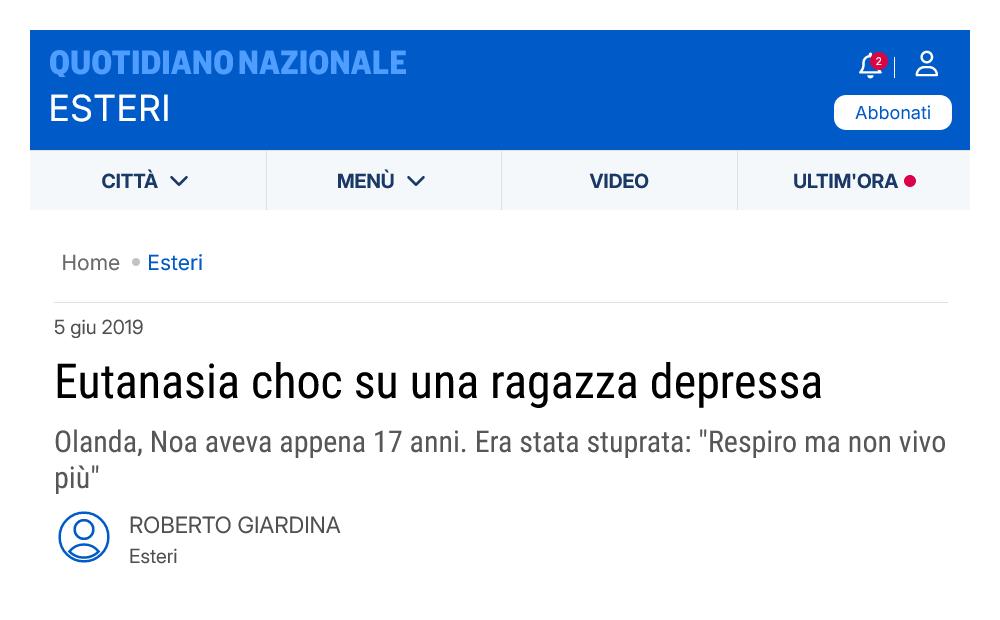 2 Errori Il nocciolo della notizia è stato dato così dalle testate italiane ed internazionali – poi corretto nei giorni successivi { [2][3][4]... } – e contiene alcuni errori. 2.1 La toponomastica posta nel pur buon articolo è consueta ma sbagliata : si deve scrivere “Paesi Bassi” e non “Olanda” – che è come definire “America” ( tutta ) gli Stati Uniti d'America, “Inghilterra” il Regno Unito oppure, fino a qualche tempo fa, “Russia” l'Unione Sovietica. Si tratta di semplificazioni erronee purtroppo usuali nel gergo discorsivo popolare, nelle quali un professionista della cronaca non dovrebbe incappare. Da quell'errore si ottiene, ed altrettanto comunemente ed erroneamente si usa, l'aggettivo “olandese” mentre quello corretto sarebbe “nederlandese” dal toponimo nazionale “Nederland”, che indica anche la lingua sovraregionale [5]. La “Olanda” consiste di due sole province ( Olanda Settentrionale, Olanda Meridionale ) sulle dodici che formano il Paese [6] e la stessa cittadina in cui è avvenuto il fatto è sita nella Gheldria [7]. 2.2 Altra questione dibattuta, è l'uso del termine “eutanasia” come descrittore del percorso di morte programmata di Noa. “Non è stata eutanasia”, ho letto parecchie volte nelle discussioni on-line. Sul termine tecnico “eutanasia” vira da anni un dibattito molto acceso nella “Italia” ( e in altri Paesi ) per la legalizzazione di tale pratica. Chi partecipa al processo normativo ha reagito in modo vigoroso, come Marco Cappato, tesoriere dell'Associazione Luca Coscioni [8]. Ma dissento sull'uso del termine minimo “suicidio” come descrittore di questo caso umano, siccome sono mancate sia la tempistica usuale che l'intimità drammatica del gesto : la stessa protagonista aveva reso pubblico il suo calvario interiore in un libro auto-biografico, calvario che per anni era stato gestito dalle strutture sanitarie pubbliche nederlandesi, aveva pubblicato la sua decisione di non alimentarsi più sulla sua bacheca Instagram [9] ed è stata assistita nel suo percorso di morte da persone che hanno lenito parzialmente la sofferenza fisica ma non hanno impedito il deperimento e il conseguente decesso ( ad esempio, praticando l'alimentazione coatta ). 3 A questo punto, è opportuno fare un passo indietro e precisare alcuni termini. 3.1 Eutanasia ? L'origine della parola è greca, e significa “buona morte”. Esistono tre modalità principali :