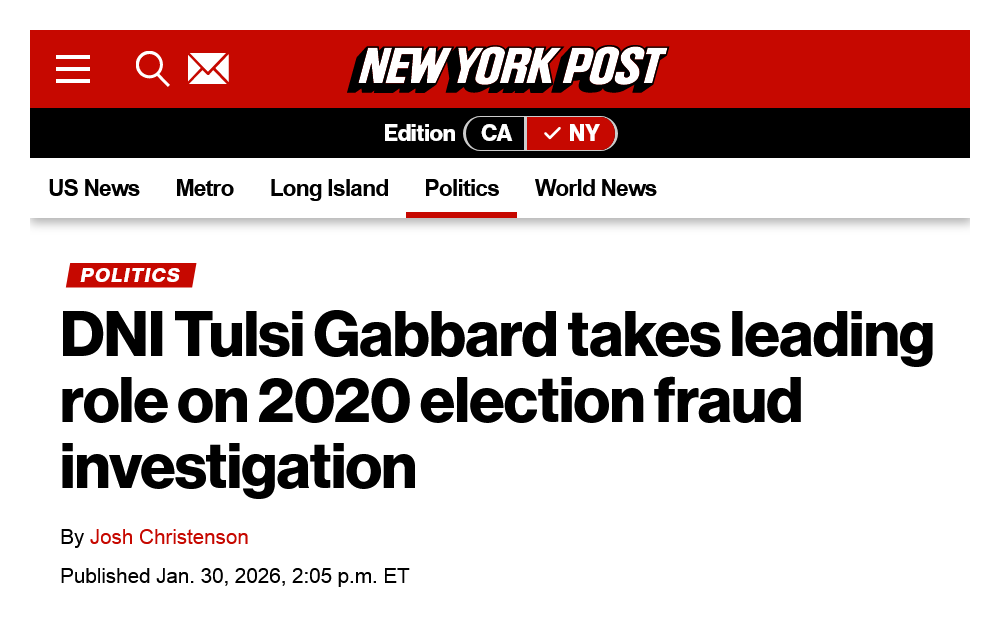 A visionare l'operazione sul campo c'era Tulsi Gabbard, la direttrice dell'intelligence nazionale ( Office of the Director of National Intelligence, ODNI ) che ha preso in carico la rediviva indagine sulle frodi elettorali del 2020 [15]. Questa nuova tranche del confronto sanguigno e mai davvero sopito tra il tycoon e lo Stato del Sud è partita dalla dichiarazione giurata di un agente speciale dell'FBI, Hugh Raymond Evans, depositata lo stesso 28 gennaio presso la Corte settentrionale della Georgia [16]. 3.1 Le redazioni vicine ai DEM stanno lavorando nel tentativo di contestare la liceità delle azioni dell'amministrazione Trump II { [17][18]... }. = Note [1] : ''Fulton County, Georgia'', AA. VV., WIkipedia ENG, [ https://en.wikipedia.org/w/index.php?title=Fulton_County,_Georgia&oldid=1336238971 ]. [2] : ''Tabulator tape'', Grokipedia, [ https://grokipedia.com/page/Tabulator_tape ]. [3] : ''Learn how Iowa tests its vote tabulator machines ahead of the 2024 general election.'', Des Moines, 3 ottobre 2024, [ https://eu.desmoinesregister.com/videos/news/elections/2024/10/03/watch-see-how-vote-tabulator-machines-are-tested-ahead-of-2024-election/75497860007/ ]. [4] : { JPG }, [ https://eastmontpeliervt.org/wp-content/uploads/2022/11/November-8-2022-Election-Results-Tabulator-Tape-pdf.jpg ]. [5] : trad. da ''Fulton County admission on unsigned voting tabulations brings back spotlight on 2020 election'', Jonathan Raymond, 11 Alive, copia registrata nell'Archive Today il 22 dicembre 2025, [ https://archive.md/aJOzY ]; vedi : ''Rule 183-1-12-.12. Tabulating Results'', Rules and Regulations of the State of Georgia, [ https://rules.sos.ga.gov/GAC/183-1-12-.12 ]. [6] : fonte #5. [7] : trad. da ''Fulton County admits to verifying 315,000 votes in 2020 without poll worker signatures'', WALB News, 23 dicembre 2025, [ https://www.walb.com/2025/12/23/fulton-county-admits-verifying-315000-votes-2020-without-poll-worker-signatures/ ]. [8] : ''November 3, 2020 Election Results'', Fulton County, 3 novembre 2020, [ https://www.fultoncountyga.gov/news/2020/11/03/november-3-election-results ]; vedi : ''Official Results'', [ https://results.enr.clarityelections.com/GA/Fulton/105430/web.264614/#/summary ]. [9] : ''2020 United States presidential election in Georgia'', AA. VV., Wikipedia ENG, [ https://en.wikipedia.org/w/index.php?title=2020_United_States_presidential_election_in_Georgia&oldid=1338494680 ]; vedi : ''Georgia'', CNN Politics, [ https://edition.cnn.com/election/2020/results/state/georgia ]. [10] : ''2020 United States presidential election'', AA. VV., Wikipedia ENG, [ https://en.wikipedia.org/w/index.php?title=2020_United_States_presidential_election&oldid=1336685625 ]; vedi : ''Presidential results'', CNN Politics, [ https://edition.cnn.com/election/2020/results/president ]. [11] : ''Attempts to overturn the 2020 United States presidential election'', AA. VV., Wikipedia ENG, [ https://en.wikipedia.org/w/index.php?title=Attempts_to_overturn_the_2020_United_States_presidential_election&oldid=1337073378 ]. [12] : ''Georgia election racketeering prosecution'', AA. VV., Wikipedia ENG, [ https://en.wikipedia.org/w/index.php?title=Georgia_election_racketeering_prosecution&oldid=1326699224 ]; vedi : ''File:Georgia election racketeering defendants.svg'', Antony-22, Wikimedia Commons, CC BY-SA 4.0, [ https://commons.wikimedia.org/w/index.php?title=File:Georgia_election_racketeering_defendants.svg&oldid=1112063015 ]. [13] : trad. dalla fonte #12, incipit, CC BY-SA 4.0. [14] : trad. da ''FBI raids Fulton County elections warehouse seeking 2020 ballots'', Maya Homan e Ross Williams, Georgia Recorder, 28 gennaio 2026, [ https://georgiarecorder.com/2026/01/28/fbi-raids-fulton-county-elections-warehouse-seeking-2020-ballots/ ]. [15] : ''DNI Tulsi Gabbard takes leading role on 2020 election fraud investigation'', Josh Christenson, New York Post, 30 gennaio 2026, [ https://nypost.com/2026/01/30/us-news/dni-tulsi-gabbard-takes-leading-role-on-2020-election-fraud-investigation/ ]; vedi : ''Spy Chief Tulsi Gabbard Is Hunting for 2020 Election Fraud'', AA. VV., The Wall Street Journal, 29 gennaio 2026, [ https://www.wsj.com/politics/elections/spy-chief-tulsi-gabbard-is-hunting-for-2020-election-fraud-07ea2383 ]. [16] : { PDF }, NYT, [ https://static01.nyt.com/newsgraphics/documenttools/ff973c0108594661/f987a94d-full.pdf ]. [17] : ''Tulsi Gabbard went down to Georgia — and no one in the Trump administration wants to take credit'', Aaron Blake, CNN, 6 febbraio 2026, [ https://edition.cnn.com/2026/02/05/politics/tulsi-gabbard-georgia-trump-fulton ]. [18] : ''How an F.B.I. Affidavit to Seize Ballots Relied on Debunked Election Claims'', AA. VV., The New York Times ( NYT ), 11 febbraio 2026, [ https://www.nytimes.com/interactive/2026/02/11/us/election-ballots-fulton-county-fbi-affadavit.html ]. === --- { prima pubblicazione del post su VK, il 20 febbraio 2026 [19] }. |