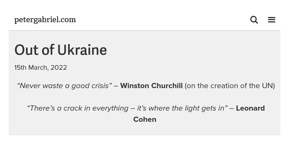 Archivio di Marco Poli Nelle discussioni sul supporto al popolo iraniano [0] espresso da Peter Gabriel [1][2], un utente ricordava come il cantautore e musicista britannico avesse anche supportato il regime di Kiev. Ahi. Sono andato a cercare e a leggere qualche pagina online. 1 E' vero che Gabriel ha espresso più volte una posizione favorevole a Kiev e contraria al Cremlino, nel contesto della guerra russo-ucraina in corso { [3]...[6]... }. Il mio primo pensiero è corso alla nazionalità dell'artista, che è inglese. L'Inghilterra, nella sua proiezione imperiale globale, è da secoli in conflitto con la Russia, moderni Leviatano ( mostro marino ) e Behemoth ( mostro terrestre ) nella visione allegorica di Carl Schmitt { [7]... }. Un antagonismo così a lungo protratto tra gli Stati, non può non lasciare sedimenti nella cultura e nel sentimento popolare tramandato di padre in figlio – si veda anche il complicato rapporto intra-slavo tra i polacchi e i russi. E questa è una chiave interpretativa. Ma Peter non è un fesso anti-russo tra i tanti che impestano l'Ovest-Europa. 1.1 Nel suo documento politico sul tema [8] esordisce male, tacciando l'Operazione militare speciale d'essere un'“invasione orribile, totalmente inutile e barbara” perpetrata dai russi, mero “spargimento di sangue” con “violenza spietata”, decisa dalla “rabbiosa e paranoica fantasia di un uomo di ricreare un impero scomparso da tempo”. Segue la solita tiritera fakkata, che il sottoscritto e probabilmente chi leggerà questo post conoscono a memoria. Senza alcun cenno agli 8 ( otto ) anni di guerra già combattuta dal 2014 ( golpe di Piazza Maidan ) nel Donbass, né alle ragioni profonde, storiche ed anche umanitarie dell'estensione del conflitto. La solita propaganda occidentale sparsa in questi anni, e dispiace leggere un artista del suo calibro che si fa megafono di questa spazzatura. Dispiace molto. Tuttavia, prosegue citando un errore occidentale storico, l'avere snobbato il possibile ingresso della Russia nella NATO ( sempre che la richiesta ed anche il rifiuto non fossero stati concordati anticipatamente tra le due parti ):