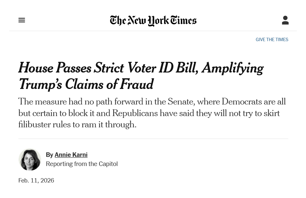 Archivio, e Notizie di Marco Poli Sinora, il 45° e 47° Presidente degli Stati Uniti d'America ha mantenuto molte promesse elettorali { [1]... }. Ha smantellato la rete USAID ed affini che pagavano editori e giornalisti di tutto il mondo per sostenere l'ideologia globalista, ha inasprito la guerra all'immigrazione illegale, sta disimpegnando l'esercito USA all'interno della NATO, ha pressato i fatiscenti Stati ovest-europei sul dossier groenlandese, ha firmato con il suo corrispettivo al Cremlino gli accordi di Anchorage, sta pressando la dittatura comunista venezuelana e quella islamista iraniana ... E lo ha fatto in poco più di un anno solare. Una roba che a noi ovest-europei tanto e giustamente disgustati da una politichetta ridicola nelle promesse oltraggiate dai fatti, tanto che oramai la maggioranza numerica dei popolani nemmeno si reca più alle urne, sembra di un altro mondo. E lo è. E' un fenomeno dell'apparato statale più prossimo ai Padroni del mondo e dominante. Catena di comando più corta, azione più autorevole e rapida. 1 L'ultima battaglia condotta da Donald Trump è quella del “Save America Act” [2] che consta di tre punti fondamentali [3]: ● presentazione di un documento d'identità valido prima di registrarsi per votare alle elezioni federali; ● presentazione di una prova di cittadinanza prima di registrarsi per votare alle elezioni federali; ● obbligo del voto in presenza, al seggio; è ammesso l'uso del servizio postale solo in caso di malattia, disabilità, servizio militare, oppure viaggio; ● obbligo di presentazione di un documento d'identità con fotografia valido, al seggio. Sono azioni ovvie e persino banali, per un cittadino italiano ed europeo in generale. Ma negli States non lo sono affatto, infatti la legge federale sulle elezioni non prevede che la persona che si presenta alle urne mostri un documento d'identità. Una farsa. Come in “Gangs of New York” ( 2002 ) di Martin Scorsese [4]. 1.1 Materiale. La proposta di legge in discussione è tecnicamente un emendamento alla Legge nazionale sulla registrazione degli elettori del 1993 ( 103° Congresso, presidenza Clinton I )[5]. Già nel 2024 ( 118° Congresso, presidenza Biden ), il senatore repubblicano Chip Roy ( Texas )[6] aveva proposto le modifiche, il testo era passato alla Camera ma non era stato votato in tempo al Senato, cioè non è stato votato prima delle elezioni e dell'insediamento del 119° Congresso il 3 gennaio 2025 [7]. La legge è stata riproposta nell'aprile 2025, ha di nuovo passato il voto della Camera, ma si è impaludata nella camera alta [8]. Alla fine di gennaio 2026, il senatore Roy ha riproposto nuovamente la legge con un nuovo numero di matricola e l'implementazione della presentazione al seggio di un documento d'identità valido e recante una fotografia [9]. 1.2 Siamo arrivati al terzo tentativo. Sempre che non me ne sia perso qualcuno. Siamo alle votazioni del parlamento federale ( il c. d. Congresso, il 119° ), e la camera bassa ( la c. d. Casa dei Rappresentanti, detta spesso e semplicemente Camera ) ha approvato la legge con risicato vantaggio dei voti favorevoli [10]: ● 218 sì; ● 213 no. Adesso, tocca al Senato. Nella camera alta troverà il probabile ostruzionismo democratico, una tattica procedurale che richiede un minimo di 60 voti ( su 100 ) per essere superata [10]. Attualmente nel Senato siedono 53 repubblicani, 45 democratici, e 2 indipendenti associati ai dem* [11]. Pertanto, se l'appello al voto bipartisan continuerà a non convincere i dem* e i rappresentanti del Popolo voteranno compatti secondo le indicazioni dei partiti, facendo pure ostruzionismo, saranno 53 voti a favore e 47 contro. Sarà dura. 2 La situazione vigente negli USA è oggettivamente assurda ma agli italiani senzienti suona abbastanza familiare, perché le concessioni civili e penali de facto – vedi, ad esempio, la recente sentenza sul risarcimento all'ONG che con la Sea Watch 3 al timone di Carola Racket(e) ha forzato un blocco della Marina italiana [12], viviamo nel delirio – agli sbarcati da ogni dove e senza alcun controllo sono lo stesso genere di sporca politica perseguita dal PD e dai sinistri in genere in Italia, con il consenso tacito della pseudo-destra. Sarebbe decisamente normale che nel più importante Paese del Blocco occidentale le elezioni venissero normate a livello federale, e poi vigilate con attenzione nei “santuari” – città e Stati aperti ai clandestini come nei sogni più bagnati della scappata di casa Racket(e) – che sono usualmente vinti e dominati dai DEM* con valanghe di voti probabilmente illegali e ottenuti usando i migranti irregolari, e con voti postali pure assai dubbi – vedi le scandalose elezioni presidenziali del 2020. 3 Allego il titolo del New York Times, l'importante quotidiano della Grande Mela ch'è notoriamente vicino all'ideologia DEM*, e vi consiglio la gustosa lettura dell'articolo [13]: