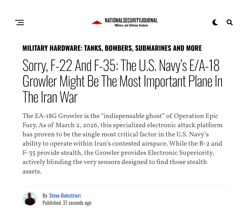 = Note [1] : ''Asse della Resistenza'', AA. VV., Wikipedia ITA, [ https://it.wikipedia.org/w/index.php?title=Asse_della_Resistenza&oldid=149621782 ]; vedi : ''File:Axis of Resistance.svg'', Wikimedia Commons, [ https://commons.wikimedia.org/w/index.php?title=File:Axis_of_Resistance.svg&oldid=1135452044 ]. [2] : ''Iran: fine dell’Asse e adattamento strategico'', Pegah Zohouri, Reset, 30 ottobre 2025, [ https://www.reset.it/articolo/iran-fine-dellasse-e-adattamento-strategico ]. [3] : ''F/A-18 Super Hornet & E/A-18 Growler'', Boeing, [ https://www.boeing.com/defense/fighters-and-bombers/fa-18-super-hornet-and-ea-18-growler ]; { PDF } : [ https://www.dote.osd.mil/Portals/97/pub/reports/FY2011/navy/2011ea18g.pdf?ver=2019-08-22-112032-660 ]; Italeri : [ https://www.italeri.com/prodotto/2096 ]; Military[punto]com : [ https://www.military.com/equipment/ea-18g-growler ]; Wiki ITA : [ https://it.wikipedia.org/w/index.php?title=Boeing_E/A-18G_Growler&oldid=149056001 ]. [4] : trad. da ''‘Electronic blackout’: How 15 Growler jets from USS Gerald R. Ford & USS Abraham Lincoln can blind Iran’s entire radar network'', Abhinav Yadav, Wion, 15 febbraio 2026, [ https://www.wionews.com/photos/-electronic-blackout-how-15-growler-jets-from-uss-gerald-r-ford-uss-abraham-lincoln-can-blind-iran-s-entire-radar-network-1771063543428/1771063543429 ]. [5] : trad. da ''Sorry, F-22 and F-35: The U.S. Navy’s E/A-18 Growler Might Be the Most Important Plane in the Iran War'', Steve Balestrieri, National Security Journal, 2 marzo 2026, [ https://nationalsecurityjournal.org/sorry-f-22-and-f-35-the-u-s-navys-e-a-18-growler-might-be-the-most-important-plane-in-the-iran-war/ ]. [6] : ''Boeing F/A-18 Super Hornet'', AA. VV., Wikipedia ITA, [ https://it.wikipedia.org/w/index.php?title=Boeing_F/A-18_Super_Hornet&oldid=149631958 ]. [7] : vedi ''Avionica'', in ''Boeing E/A-18G Growler'', AA. VV., Wikipedia ITA, [ https://it.wikipedia.org/w/index.php?title=Boeing_E/A-18G_Growler&oldid=149056001#Avionica ]. [8] : ''L3Harris EA-37B Compass Call II'', AA. VV., Wikipedia ITA, [ https://it.wikipedia.org/w/index.php?title=L3Harris_EA-37B_Compass_Call_II&oldid=147490520 ]. [9] : ''Gulfstream G550'', AA. VV., Wikipedia ITA, [ https://it.wikipedia.org/w/index.php?title=Gulfstream_G550&oldid=149033207 ]. [10] : ''US Air Force receives first new Compass Call electronic warfare plane'', Stephen Losey, Air Force Times, 13 settembre 2023, [ https://www.airforcetimes.com/air/2023/09/12/us-air-force-receives-first-new-compass-call-electronic-warfare-plane/ ]. [11] : ''L’Italia acquista due velivoli EA-37B Compass Call'', Aviation Report, 22 luglio 2025, [ https://www.aviation-report.com/italia-acquista-due-velivoli-ea-37b-compass-call/ ]. [12] : ''EA-37B Vs EA-18G Growler: How Do Electronic Warfare Aircraft Capabilities Compare?'', Luke Diaz, Simple Flying, 31 dicembre 2024, [ https://simpleflying.com/ea-37b-vs-ea-18g-growler-how-electronic-warfare-capabilities-compare/ ]. [13] : ''USAF Deploys EA-37B Compass Call II to Ramstein Air Base as Middle East Tensions Drive Surge in Electromagnetic Warfare Readiness'', Defence Security Asia, 26 gennaio 2026, [ https://defencesecurityasia.com/en/usaf-ea37b-compass-call-ii-ramstein-middle-east-electronic-warfare/ ]. [14] : ''sistema difensivo iraniano growler'', AI Overview, Google, [ https://www.google.com/search?q=sistema+difensivo+iraniano+growler ]. [15] : post, Raffaele Terlizzi, Facebook, 2 marzo 2026, [ https://www.facebook.com/story.php?story_fbid=10232312256174317&id=1391436978 ]. === --- { prima pubblicazione del post su VK, il 3 marzo 2026 [16] }. |