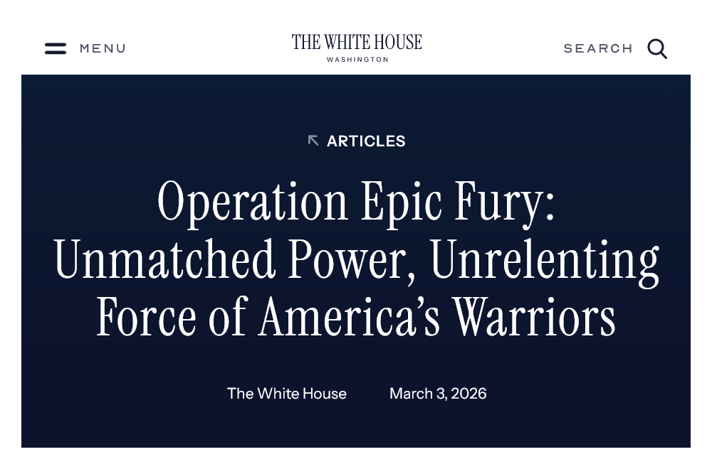 = Note [1] : trad. da ''Operation Epic Fury: Unmatched Power, Unrelenting Force of America’s Warriors'', The White House, 3 marzo 2026, [ https://www.whitehouse.gov/articles/2026/03/operation-epic-fury-unmatched-power-unrelenting-force-of-americas-warriors/ ]. [2] : ''US hits nearly 2K Iranian targets in first 100 hours of Operation Epic Fury — officials warn strikes will continue ‘from seabed to space and cyberspace’'', Nicholas McEntyre, New York Post, 4 marzo 2026, [ https://nypost.com/2026/03/04/world-news/us-operation-epic-fury-struck-2k-iran-targets-in-first-100-hours/ ]. [3] : ''Hegseth says Iran war has ‘only just begun’ — but Islamic Republic is ‘toast and they know it’'', Caitlin Doornbos, New York Post, 4 marzo 2026, [ https://nypost.com/2026/03/04/us-news/hegseth-iran-war-has-only-just-begun-but-islamic-republic-is-toast-and-they-know-it/ ]. [4] : ''Operazione Epic Fury: tornano in azione i bombardieri strategici B-2'', Davide Bartoccini, il Giornale, 1° marzo 2026, [ https://www.ilgiornale.it/news/guerra/operazione-epic-fury-tornano-azione-i-bombardieri-strategici-2630848.html ]. [5] : ''Centcom, 50.000 soldati Usa ora assegnati alla guerra contro l'Iran'', ANSA, 4 marzo 2026, [ https://www.ansa.it/sito/notizie/mondo/2026/03/04/centcom-50.000-soldati-usa-ora-assegnati-alla-guerra-contro-liran_65cdbea1-0c01-4e68-977a-331ef1bad2a0.html ]. === --- { prima pubblicazione del post su VK, il 4 marzo 2026 [6] }. |