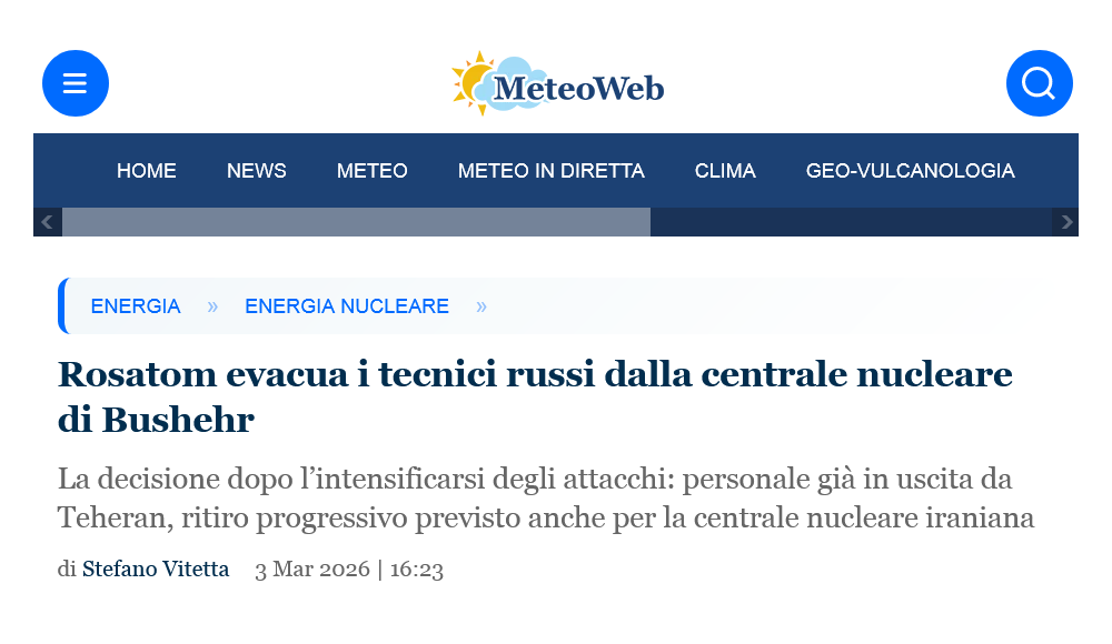 Gli ultimi dispacci dicono che sono stati evacuati 150 tecnici russi impegnati nella costruzione dei reattori n. 2 e 3 attraverso l'Armenia, e circa 450 sono ancora nel Paese iranico [12]. Anche loro verranno evacuati, e Likhachjov ha dichiarato che si tratta della messa in sicurezza del proprio personale, ma Rosatom non rinuncia alla costruzione dei nuovi reattori [13]. = Note [1] : ''Rosatom evacua i tecnici russi dalla centrale nucleare di Bushehr'', Stefano Vitetta, MeteoWeb, 3 marzo 2026, [ https://www.meteoweb.eu/2026/03/rosatom-evacua-i-tecnici-russi-dalla-centrale-nucleare-di-bushehr/1001904604/ ]; vedi : ''Russia halts construction work at Bushehr nuclear plant due to strikes on Iran'', Reuters, 3 marzo 2026, [ https://www.reuters.com/world/russia-raises-alarm-over-conflicts-impact-bushehr-nuclear-plant-iran-2026-03-03/ ]. [2] : ''Bushehr Nuclear Power Plant (BNPP)'' ( ''Centrale nucleare di Bushehr'' ), NTI, [ https://www.nti.org/education-center/facilities/bushehr-nuclear-power-plant-bnpp/ ]; Google Maps : [ https://www.google.com/maps/@28.8291478,50.8849899,1325m/ ]. [3] : ''Bushehr Nuclear Power Plant'', AA. VV., Wikipedia ENG, CC BY-SA 4.0, [ https://en.wikipedia.org/w/index.php?title=Bushehr_Nuclear_Power_Plant&oldid=1341686722 ]. [4] : ''Iran Breakthrough for Russian Nuclear'', Anton Khlopkov, Moscow Defense Brief, n. 1, 2010, { PDF }, [ https://wikileaks.org/gifiles/attach/176/176890_mdb_1_2010_sm.pdf ]. [5] : trad. da ''Difficulties'', fonte #3. [6] : fonte #3. [7] : ''Nuclear program of Iran'', AA. VV., Wikipedia ENG, [ https://en.wikipedia.org/w/index.php?title=Nuclear_program_of_Iran&oldid=1343263857 ]; vedi : ''File:IranSites.png'', Daseyn, Wikimedia Commons, [ https://commons.wikimedia.org/w/index.php?title=File:IranSites.png&oldid=1139140091 ]. [8] : ''Il programma nucleare iraniano sotto i riflettori'', RSI Radiotelevisione svizzera, 13 giugno 2025, [ https://www.rsi.ch/info/mondo/Il-programma-nucleare-iraniano-sotto-i-riflettori--2904393.html ]. [9] : ''Iran-AIEA: una sospensione che mette a rischio il regime di non proliferazione nucleare'', G. Pelosi, IRIAD, [ https://www.archiviodisarmo.it/analisi-iran-aiea-iran-aiea-una-sospensione-che-mette-a-rischio-il-regime-di-non-proliferazione-nucleare.html ]. [10] : ''Guerra Iran-Israele del 2025'', AA. VV., Wikipedia ITA, [ https://it.wikipedia.org/w/index.php?title=Guerra_Iran-Israele_del_2025&oldid=149783003 ]. [11] : ''Rosatom: abbiamo perso i contatti con la dirigenza nucleare dell’Iran'', Umberto Mazzantini, Greenreport, 4 marzo 2026, [ https://www.greenreport.it/news/nuove-energie/60466-rosatom-abbiamo-perso-i-contatti-con-la-dirigenza-nucleare-delliran ]. [12] : ''Iran: Likhachev (Rosatom), da centrale nucleare Bushehr evacuati 150 dipendenti russi attraverso Armenia'', Agenzia Nova, 11 marzo 2026, [ https://www.agenzianova.com/a/69b26ad4432841.56136445/7132261/2026-03-11/iran-likhachev-rosatom-da-centrale-nucleare-bushehr-evacuati-150-dipendenti-russi-attraverso-armenia ]. [13] : ''«Росатом» не планирует оставлять иранскую АЭС «Бушер»'' ( ''Rosatom non ha intenzione di abbandonare la centrale nucleare iraniana di Bushehr'' ), Ведомости ( Vedomosti ), 12 marzo 2026, [ https://www.vedomosti.ru/politics/news/2026/03/12/1182411-rosatom-ne-planiruet-ostavlyat ]. === --- { prima pubblicazione del post su VK, il 13 marzo 2026 [14] }. |