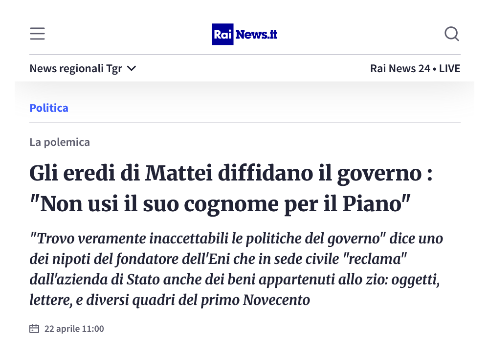 Come detto più volte su questa bacheca, il rifiuto del gas russo è il cappio intorno al collo della produzione non solo italiana ma ovest-europea in generale. Bunkerarsi nella psicotica Unione Europea produce e produrrà danni sempre maggiori. E' pertanto comprensibile il disappunto degli eredi di un uomo che aveva grandi ambizioni personali e nazionali, e una visione competitiva e vincente per l'industria italiana dell'energia che supportò adeguatamente il boom economico post-bellico, spingendo il nostro Paese tra le primissime potenze industriali ed economiche del mondo. Mi sembra che la sig.na Aspen abbia solo a cuore l'interesse personale spicciolo, è solo chiacchiere. = Note [1] : ''Notizie, e Archivio'', Marco Poli, VK, 26 gennaio 2023, [ https://vk.com/wall170191717_3068 ]; ODB : [ https://orlodelboccale.blogspot.com/2023/01/ruukr183-le-sanzioni-boomerang-hanno.html ]. [2] : ''Enrico Mattei: biografia, pensiero e causa della morte'', Giordano Pulvino, Fatti per la Storia, 18 aprile 2025, [ https://www.fattiperlastoria.it/enrico-mattei-biografia/ ]; Treccani : [ https://www.treccani.it/enciclopedia/enrico-mattei_(Dizionario-Biografico)/ ]; Wiki ITA : [ https://it.wikipedia.org/w/index.php?title=Enrico_Mattei&oldid=150320204 ]. [3] : ''Enrico Mattei.Intervista con un giornalista USA (dal film "IL CASO MATTEI)'', Klavius60, YouTube, 11 marzo 2018, [ https://www.youtube.com/watch?v=8BCSd805TBQ ]. [4] : ''Mattei e le sette sorelle'', Museo Enrico Mattei, YouTube, 29 maggio 2021, [ https://www.youtube.com/watch?v=6OxpIkVPSJQ ]. [5] : ''Corruzione, Petrolio e Mattei: Andreotti risponde a Biagi (1981)'', AccasFilm, YouTube, 2 apr 2025, [ https://www.youtube.com/watch?v=9RjMSTt6ssE ]. [6] : ''Assistente di ENRICO MATTEI svela segreti su omicidio, cartello del petrolio e privatizzazioni!'', Ibex Edizioni, YouTube, 30 ottobre 2023, [ https://www.youtube.com/watch?v=Z7tMqbAoDZc ]. [7] : ''Le strategie di Enrico Mattei, con Federico Mosso'', Ibex Edizioni, YouTube, 29 ottobre 2024, [ https://www.youtube.com/watch?v=JX4aQ10rSZo ]. [8] : ''Piano Mattei per l'Africa'', Presidenza del Consiglio dei Ministri, Governo Italiano, [ https://www.governo.it/it/piano-mattei ]; Wiki ITA : [ https://it.wikipedia.org/w/index.php?title=Piano_Mattei_per_l%27Africa&oldid=148780838 ]. [9] : ''Gli eredi di Mattei diffidano il governo : "Non usi il suo cognome per il Piano"'', Rai News, 22 aprile 2026, [ https://www.rainews.it/articoli/2026/04/gli-eredi-di-mattei-diffidano-il-governo-non-usi-il-suo-cognome-per-il-piano-9e97578d-da87-4fa1-a591-0b2c7d675211.html ]. [10] : fonte #9. === --- { prima pubblicazione del post su VK, il 23 aprile 2026 [11] }. |